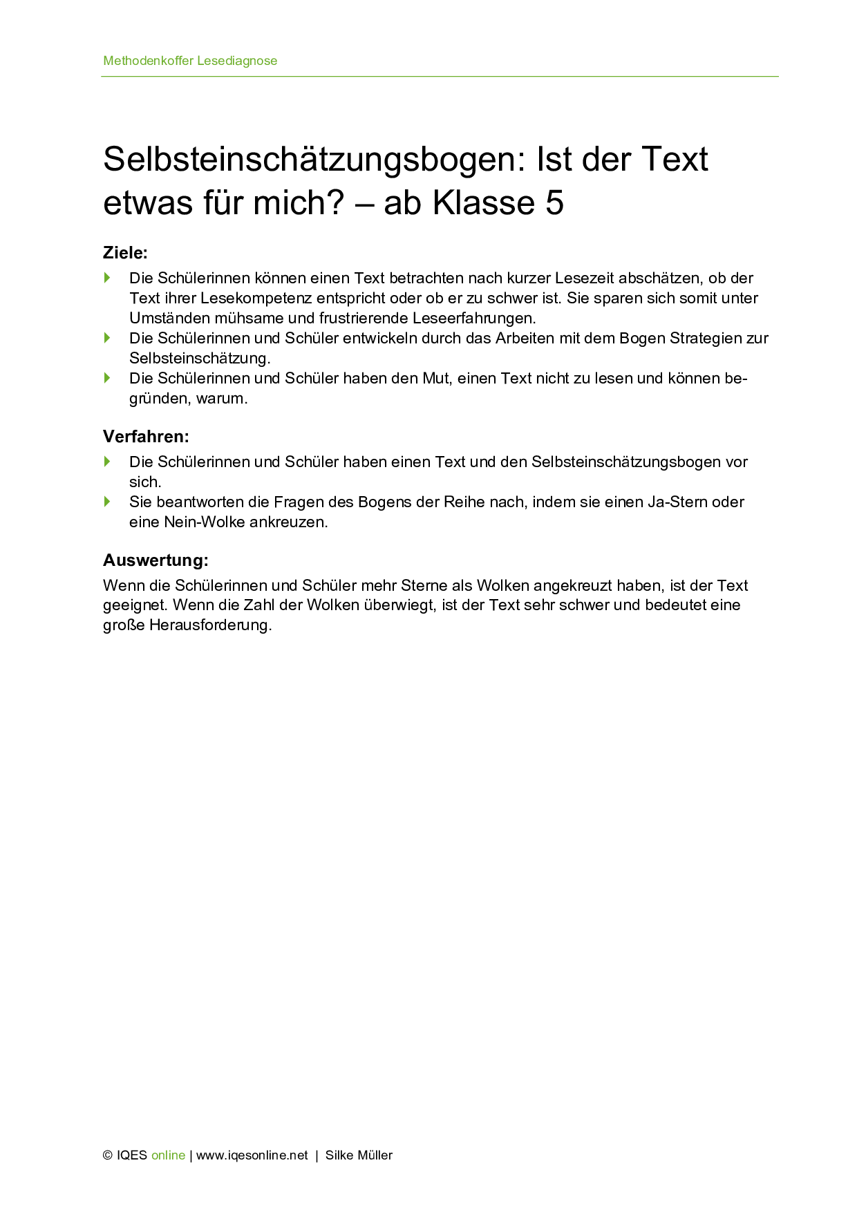 Mit Hilfe der Fragen in diesem Dokument, können Schülerinnen und Schüler der 5. Klassenstufe abschätzen, ob ein Text ihrer Lesekompetenz entspricht oder ob er zu schwer ist. Aus dem Methodenkoffer Lesediagnose.