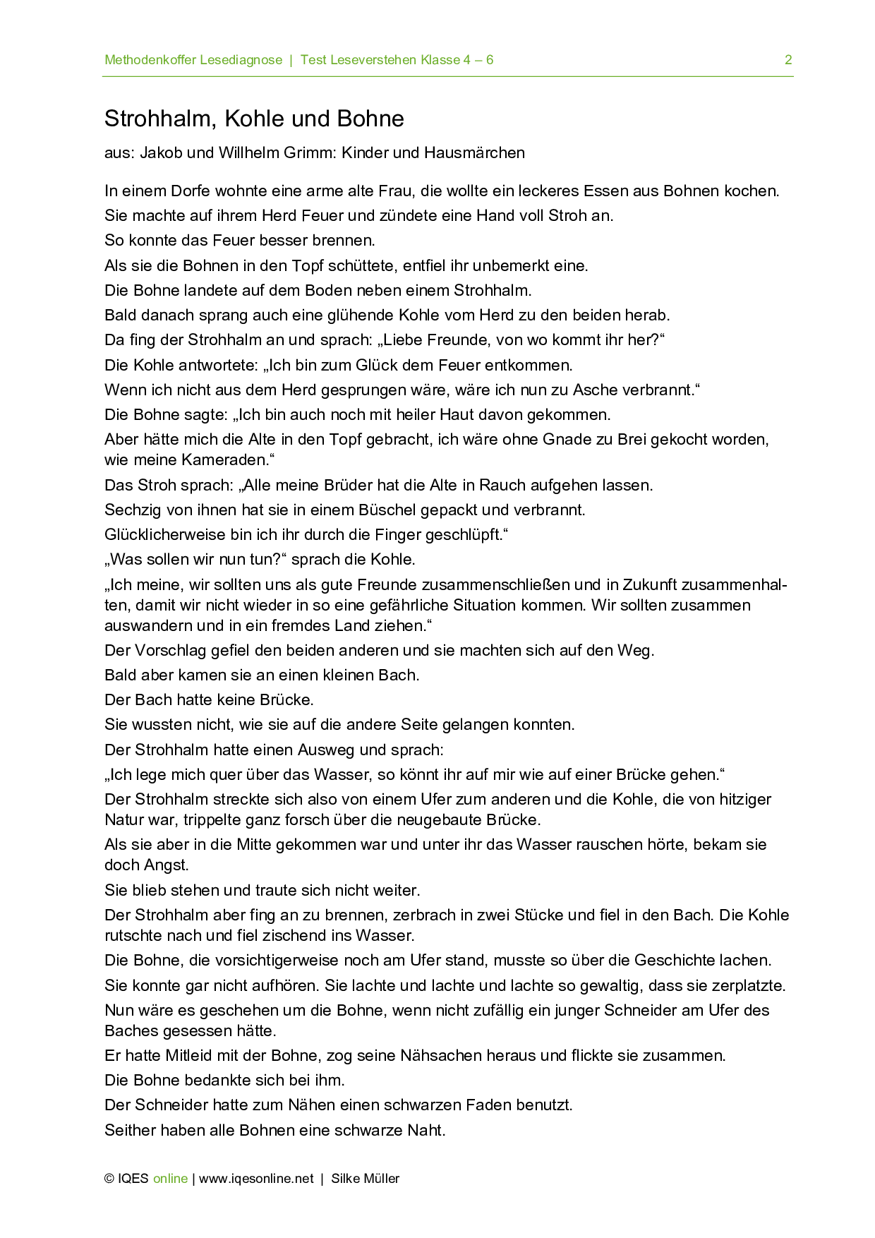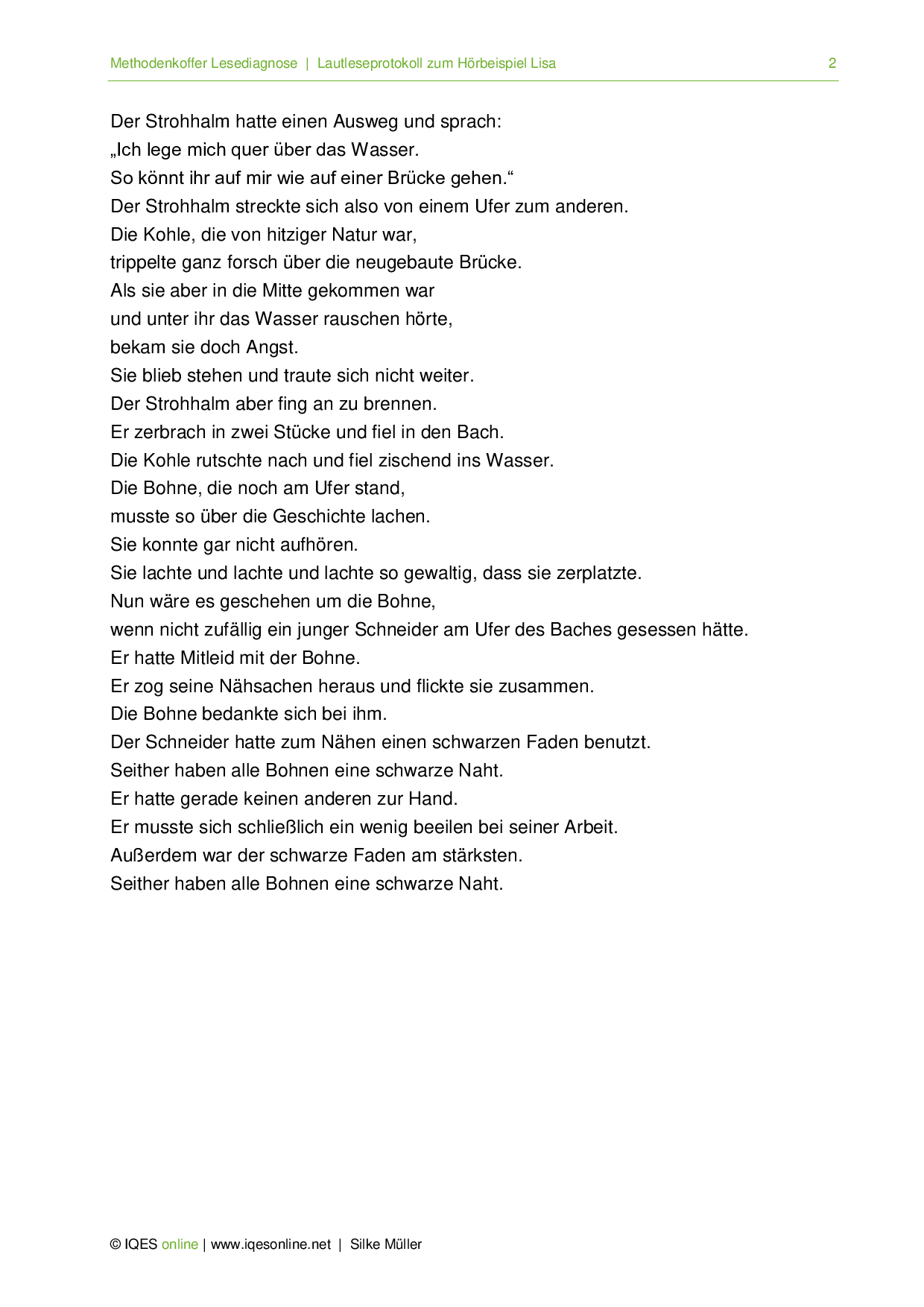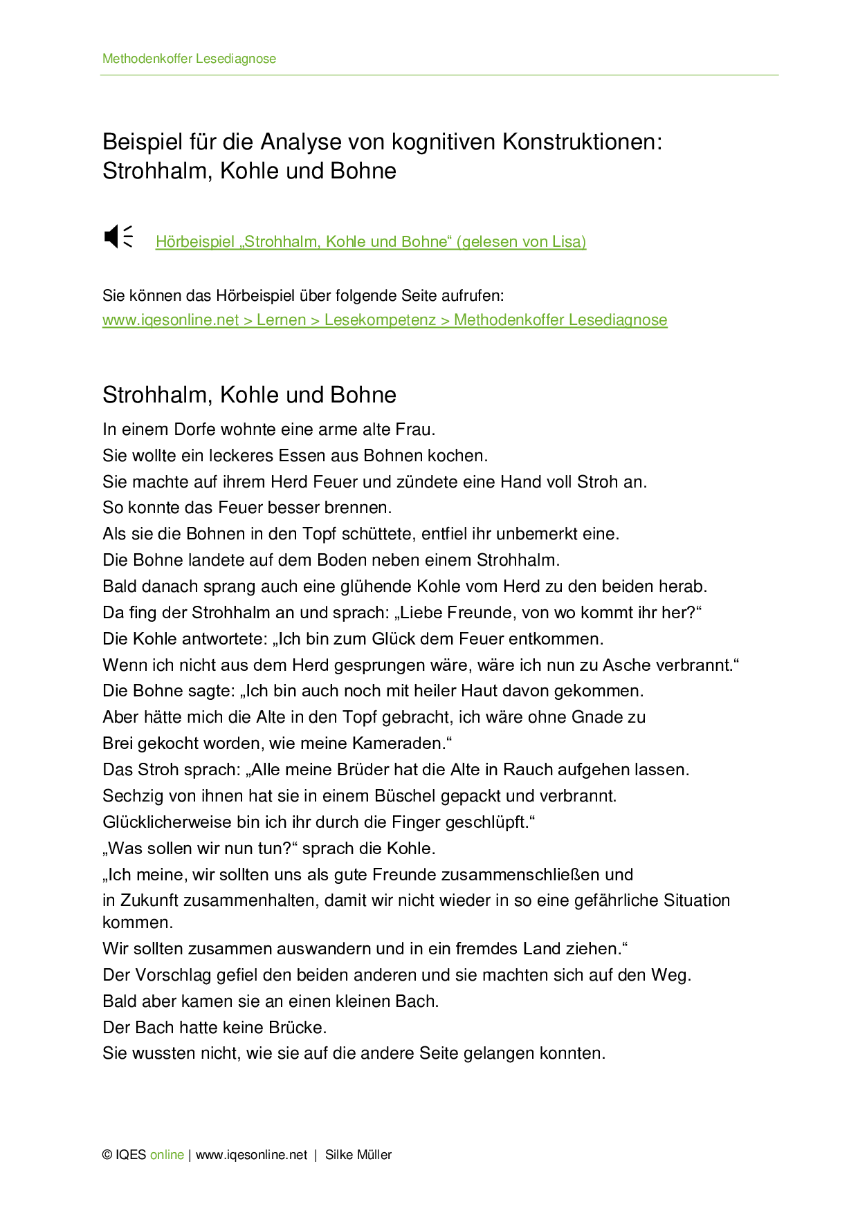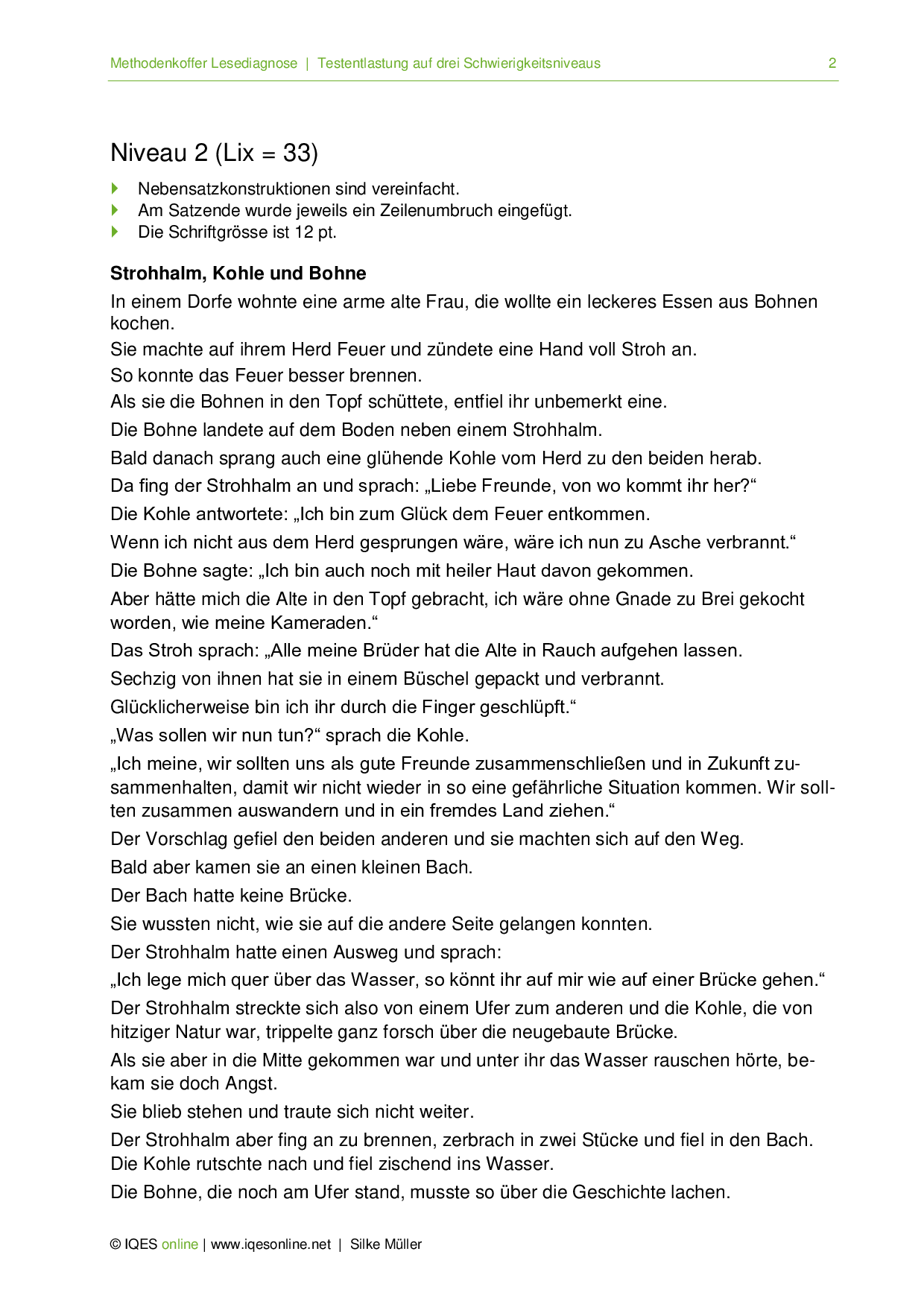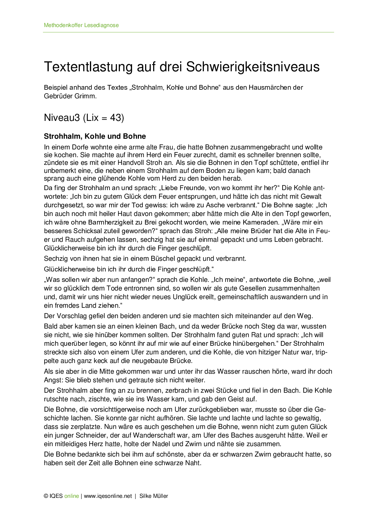 Anhand der Geschichte Strohhalm, Kohle und Bohne wird hier gezeigt, wie ein Text vereinfacht werden kann. Dabei sind drei Niveaus aufgezeigt, welche jeweils einen anderen Lix aufweisen. Das Beispiel stammt aus dem Methodenkoffer Lesediagnose.