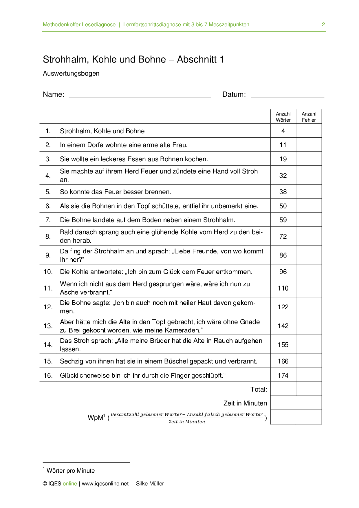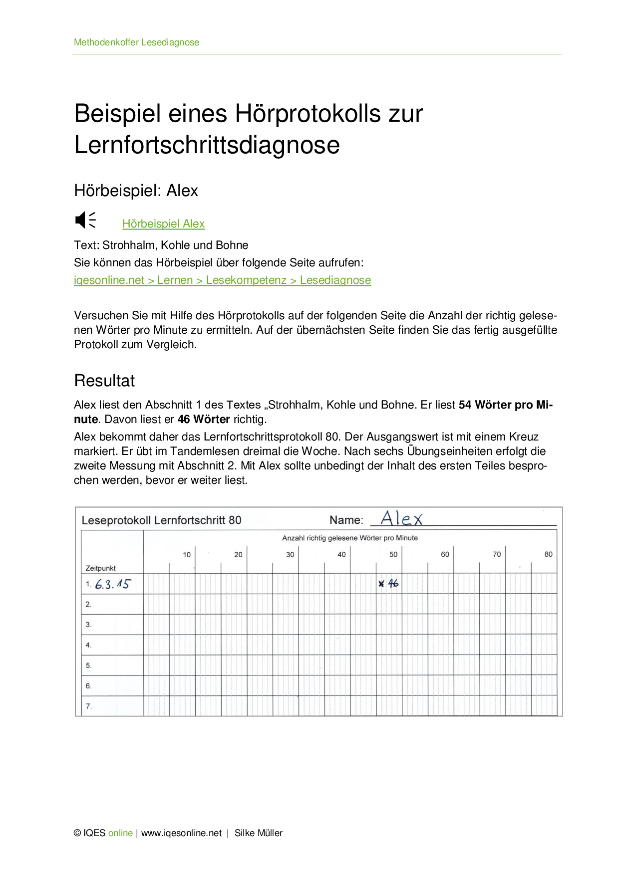 Das Dokument dient als Beilage zur Aufnahme Strohhalm, Kohle und Bohne, gelesen von Alex. Es enthält das Protokoll zur Erfassung von Lesetempo und Lesegenauigkeit sowie Erläuterungen.