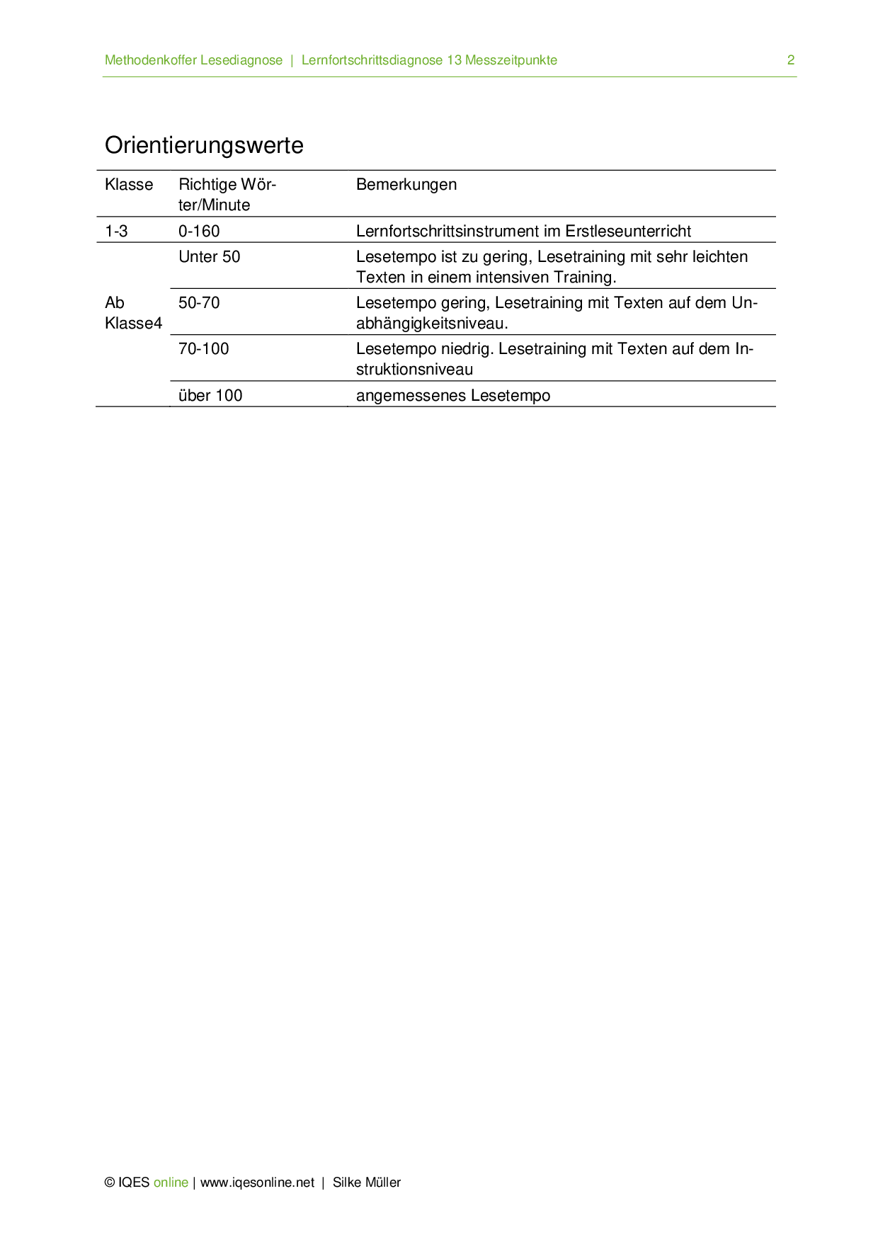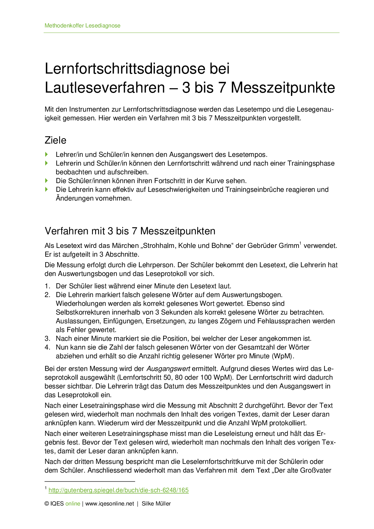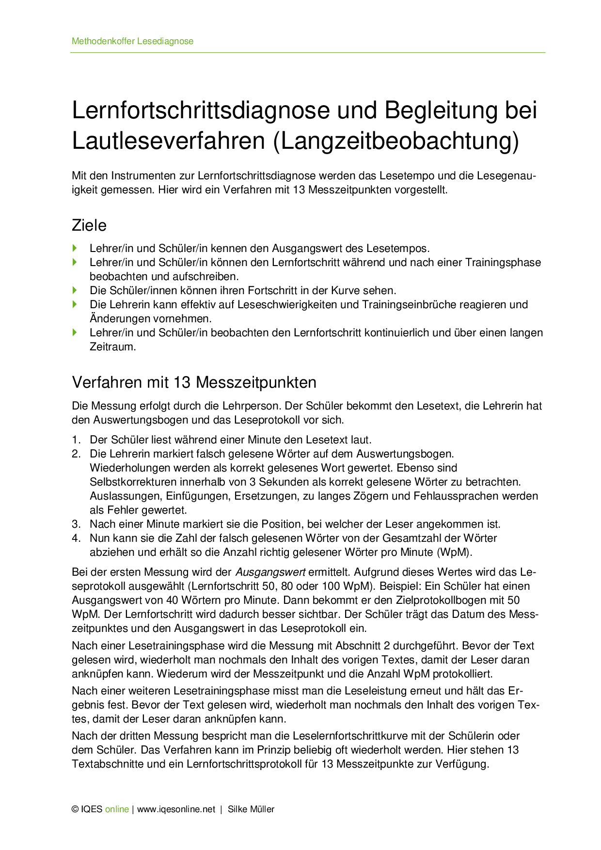 Hier stellen wir ein Lautleseverfahren vor, mit dem man die Anzahl der richtig gelesenen Wörter pro Minute (WpM) misst. Die Messung wird jeweils nach einer Lesetrainingsphase vorgenommen und kann mehrmals wiederholt werden.