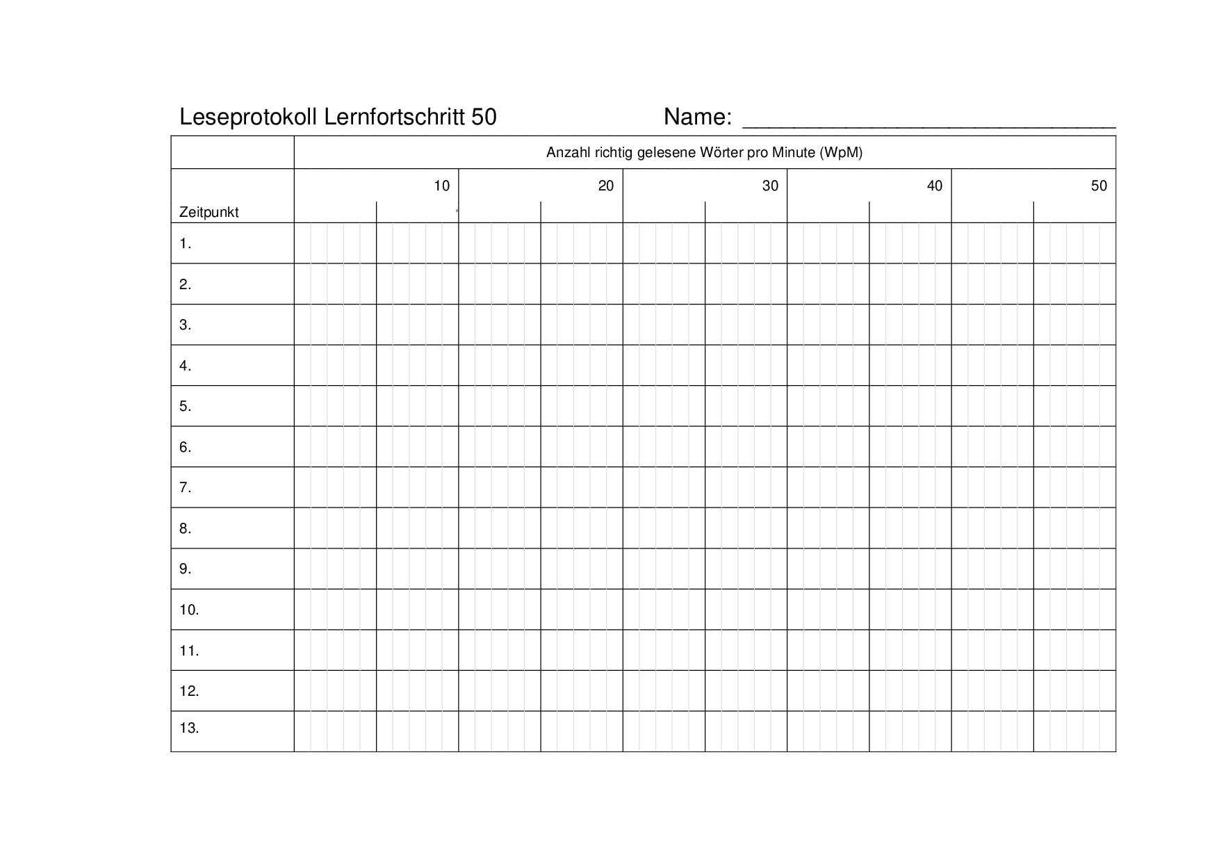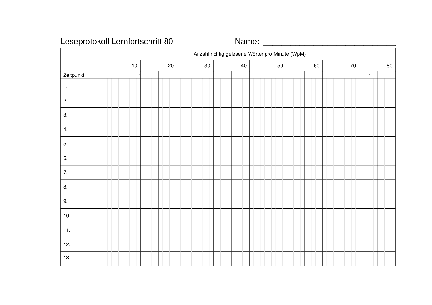 In diesem Dokument befinden sich drei Protokolle zur Erfassung des Lernfortschritts im Lesetempo sowie in der Genauigkeit. Ziel ist es, 50, 80 oder 100 Wörter pro Minute (WpM) zu erreichen.