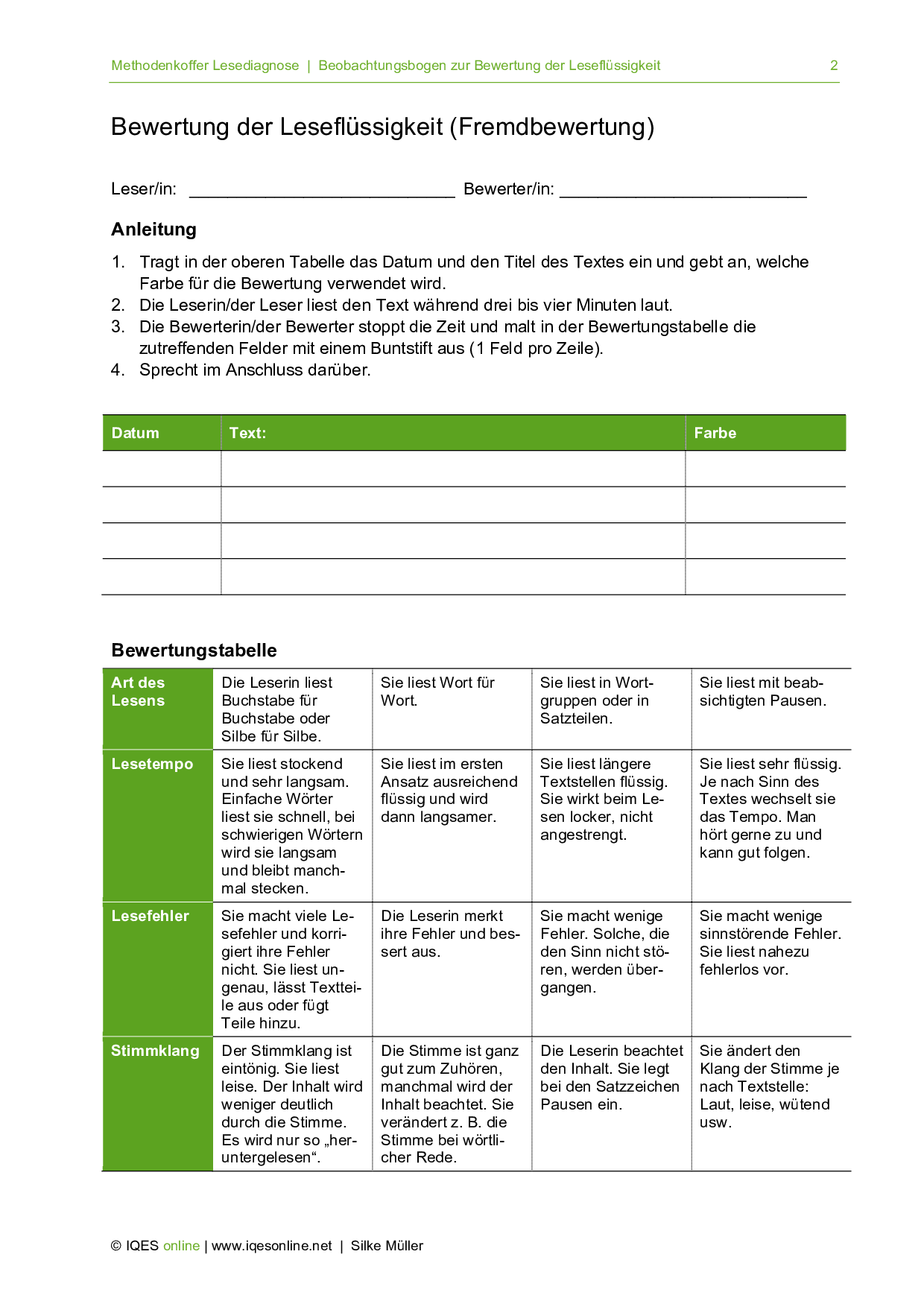 Mit Hilfe der Anleitung und der Bewertungstabelle können Schülerinnen und Schüler die Leseflüssigkeit des Partners und der Partnerin einschätzen.