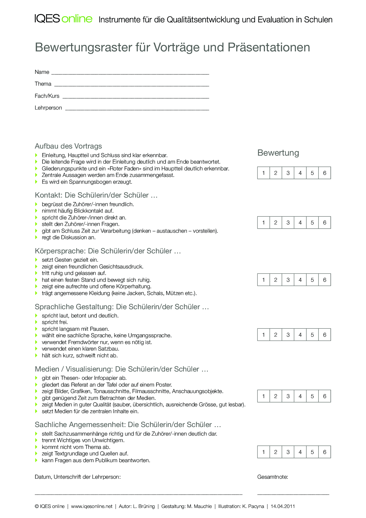 Mit diesem Raster kann die Notengebung von Vorträgen und Präsentationen gestaltet werden. Die Bewertungskriterien sind Aufbau des Vortrags, Kontakt zum Publikum, Körpersprache, sprachliche Gestaltung, Medien/Visualisierung sowie sachliche Angemessenheit.