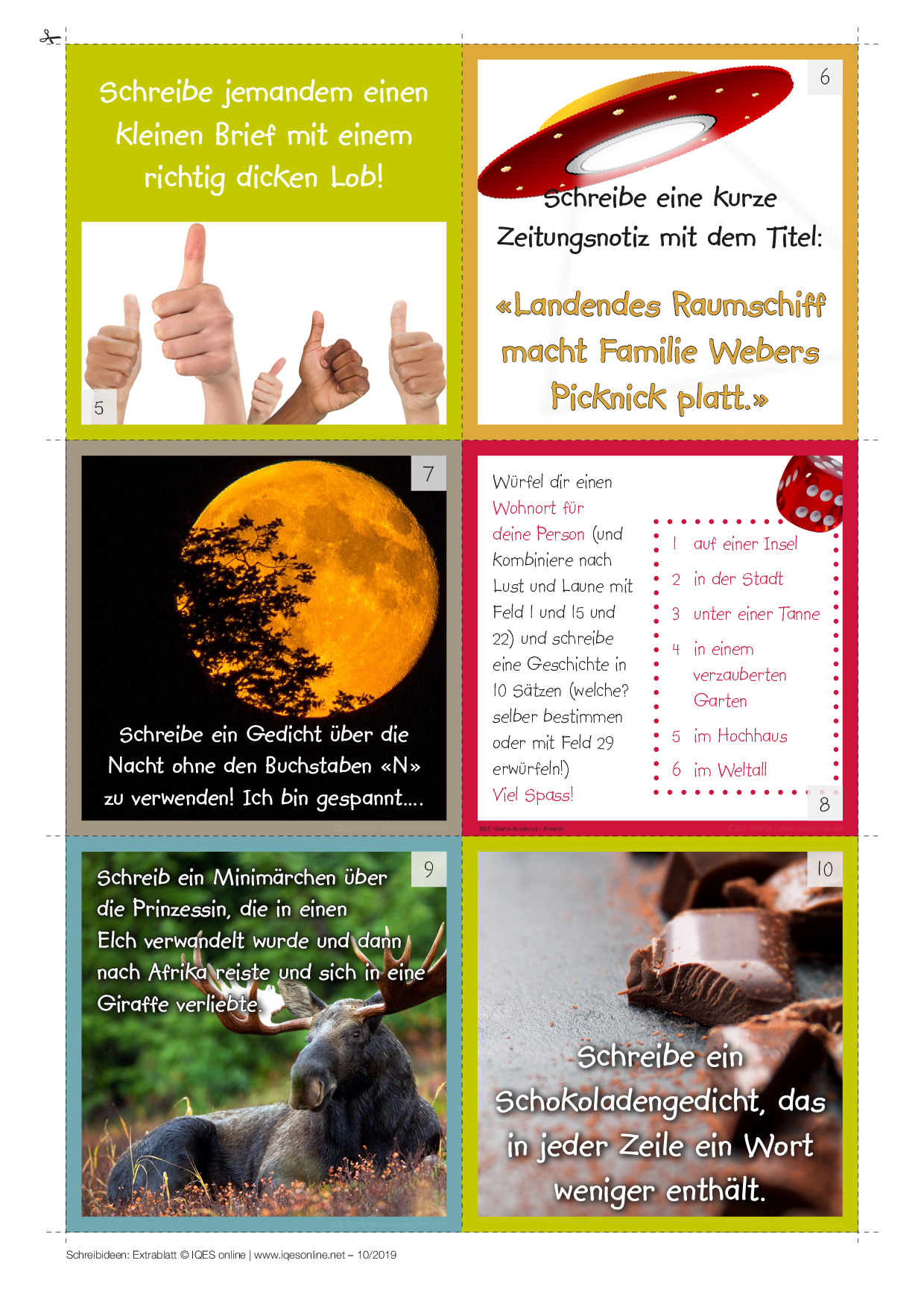 45 Schreibkarten mit den unterschiedlichsten Schreibideen: Sie können als Schreibwürfelspiel, als Schreibwegplaner, als Schreibkarten oder andersweitiger Ideenlieferanten eingesetzt werden. Die Schreibkarten können zur freien oder zufälligen Auswahl genutzt werden.
