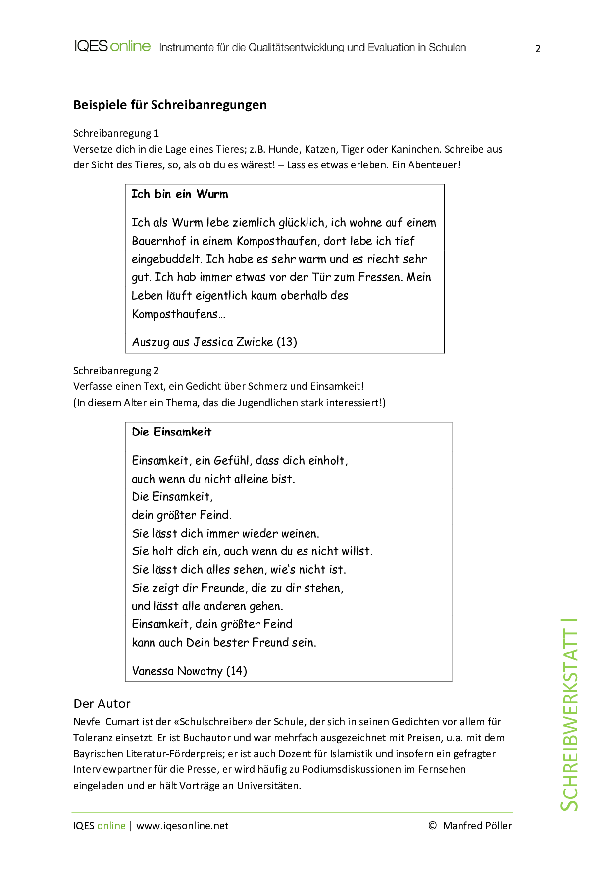 Mit dieser Schreibwerkstatt werden die Schüler/innen dazu angeregt, eigene Texte zu verfassen. Ziel ist es, diese Texte später vor Ort in der Bibliothek und eine Auswahl in eigenen Broschüren zu veröffentlichen. Mit der Schreibwerkstatt verbessert sich die Lese- und Schreibfähigkeit, vor allem auch von Kindern mit Migrationshintergrund. Auch die Lesekompetenz wird verbessert: Der Wortschatz wird erweitert und es werden Fachbegriffe und Sachkenntnisse erworben. Durch den kreativen Schreibprozess wird die Motivation fürs Schreiben gefördert.