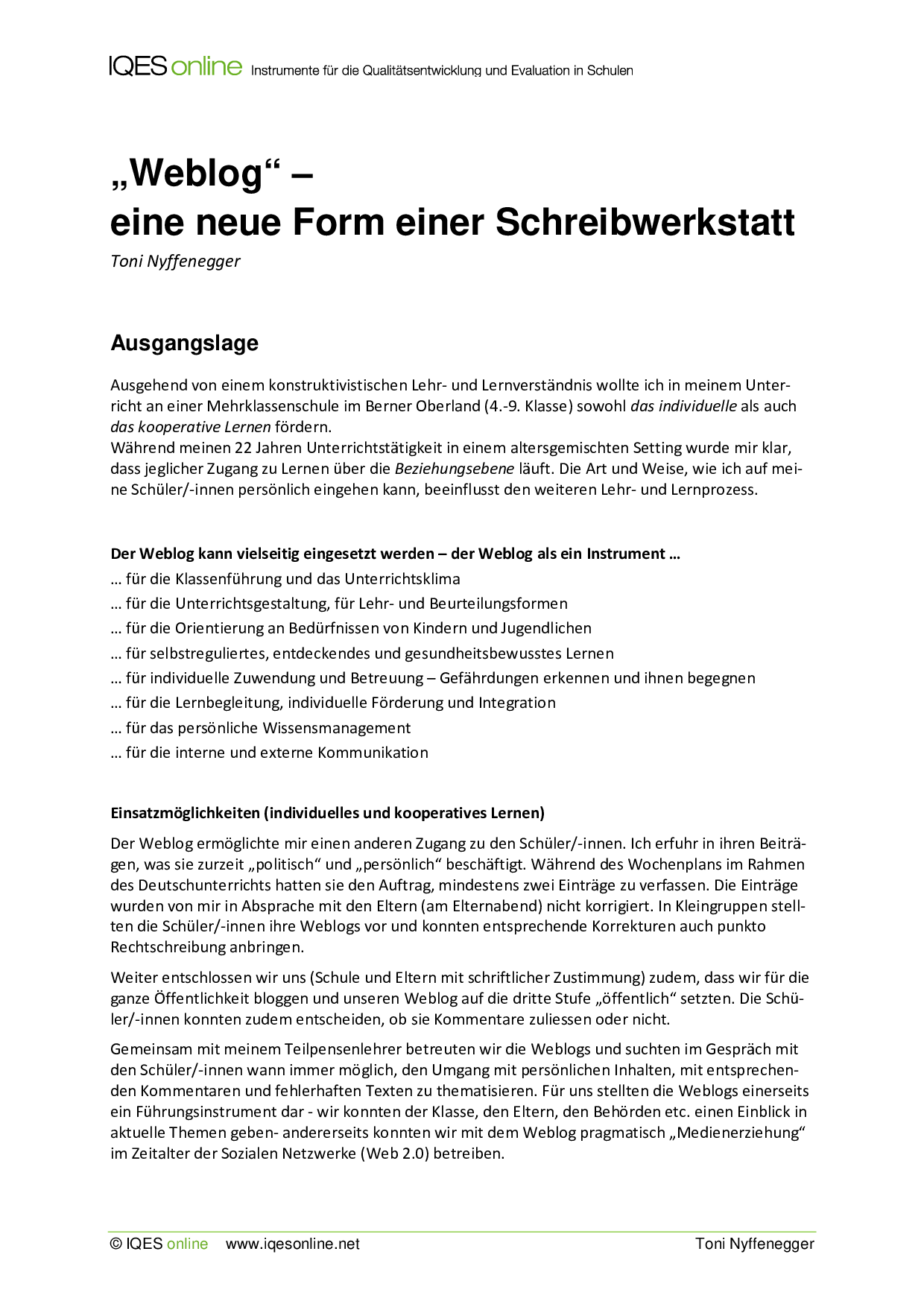 Wie Weblog als Schreibwerkstatt genutzt werden kann, ist auf diesem Informationsblatt zusammengefasst. Neben den Einsatzmöglichkeiten wird auch auf den didaktischen und erzieherischen Mehrwert eingegangen und nützliche Tipps für die praktische Umsetzung vermittelt.