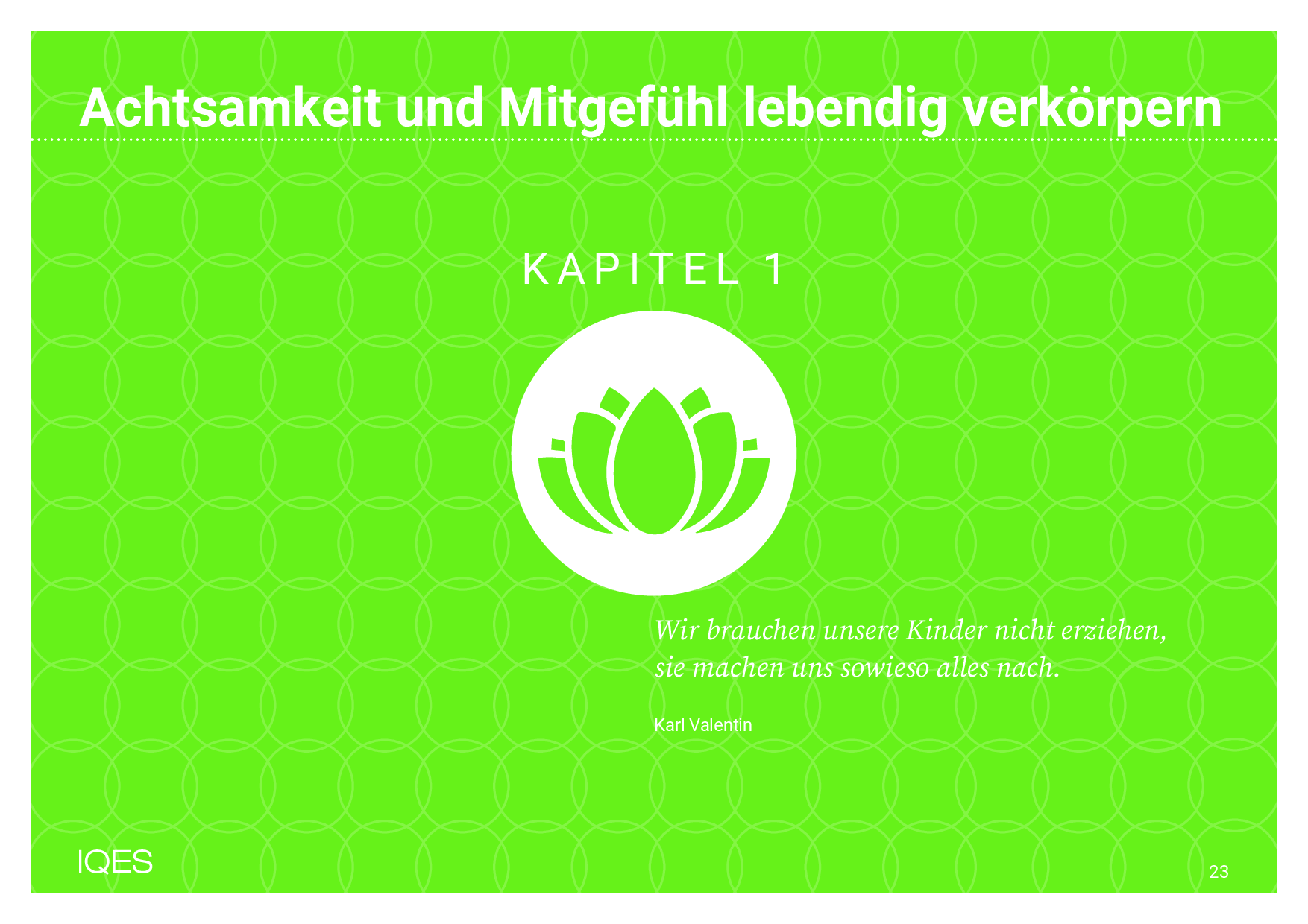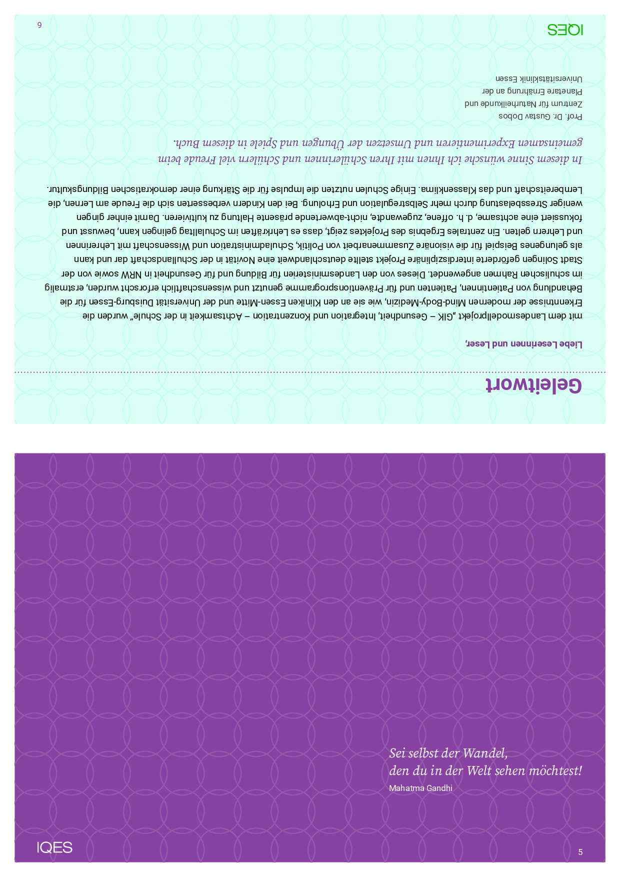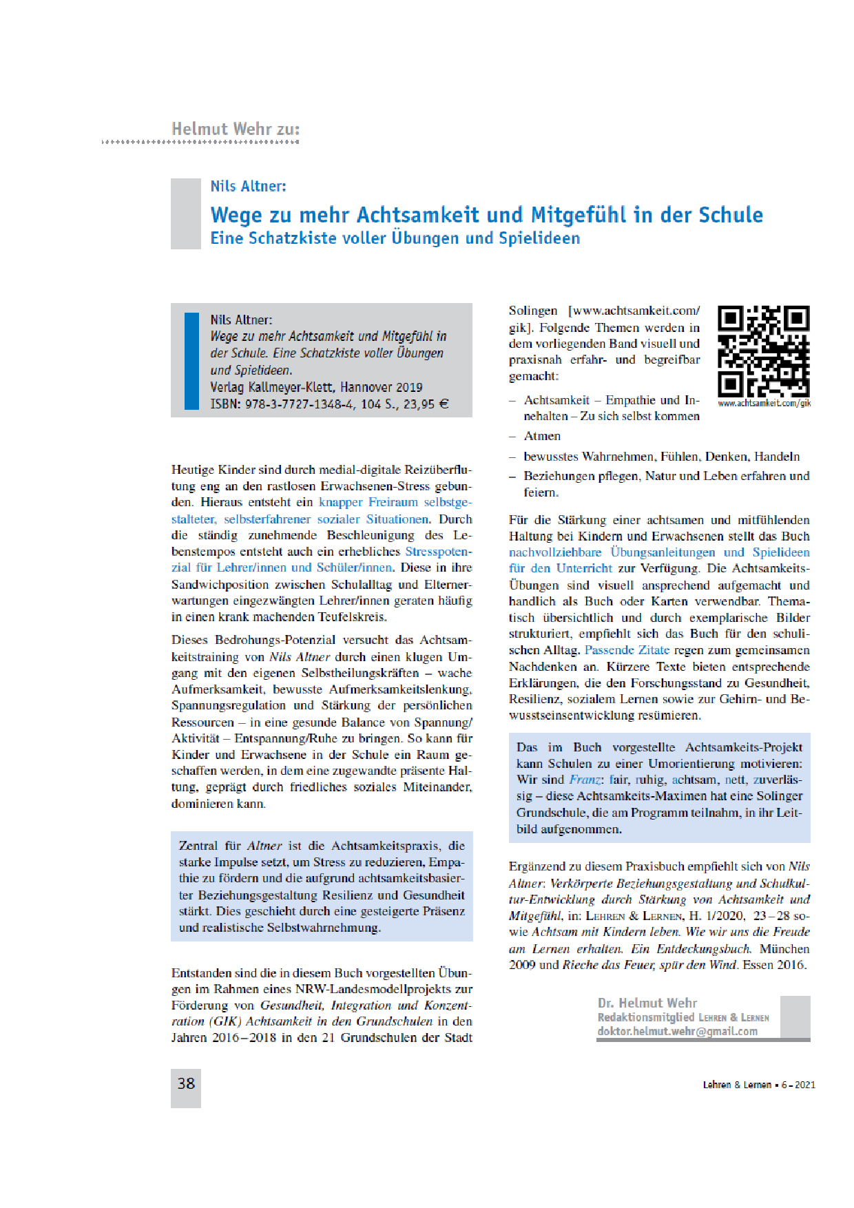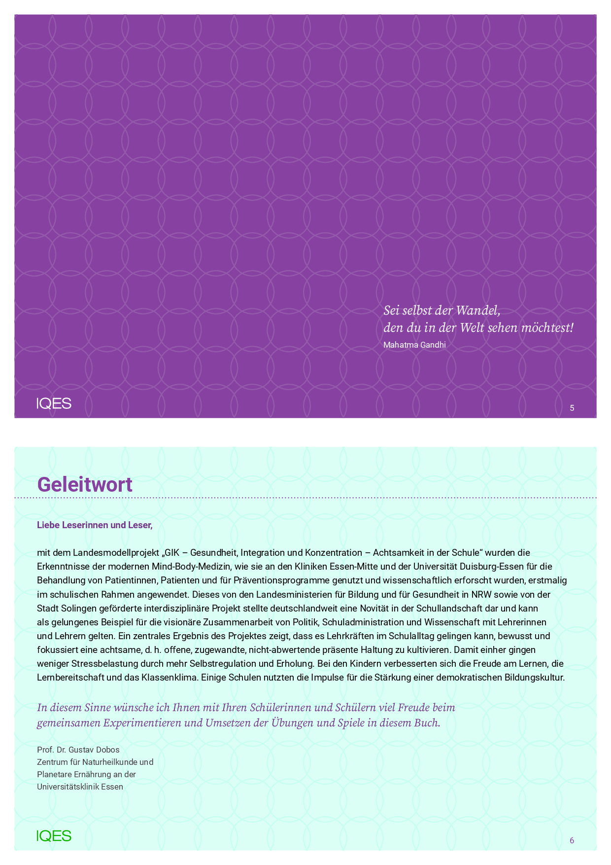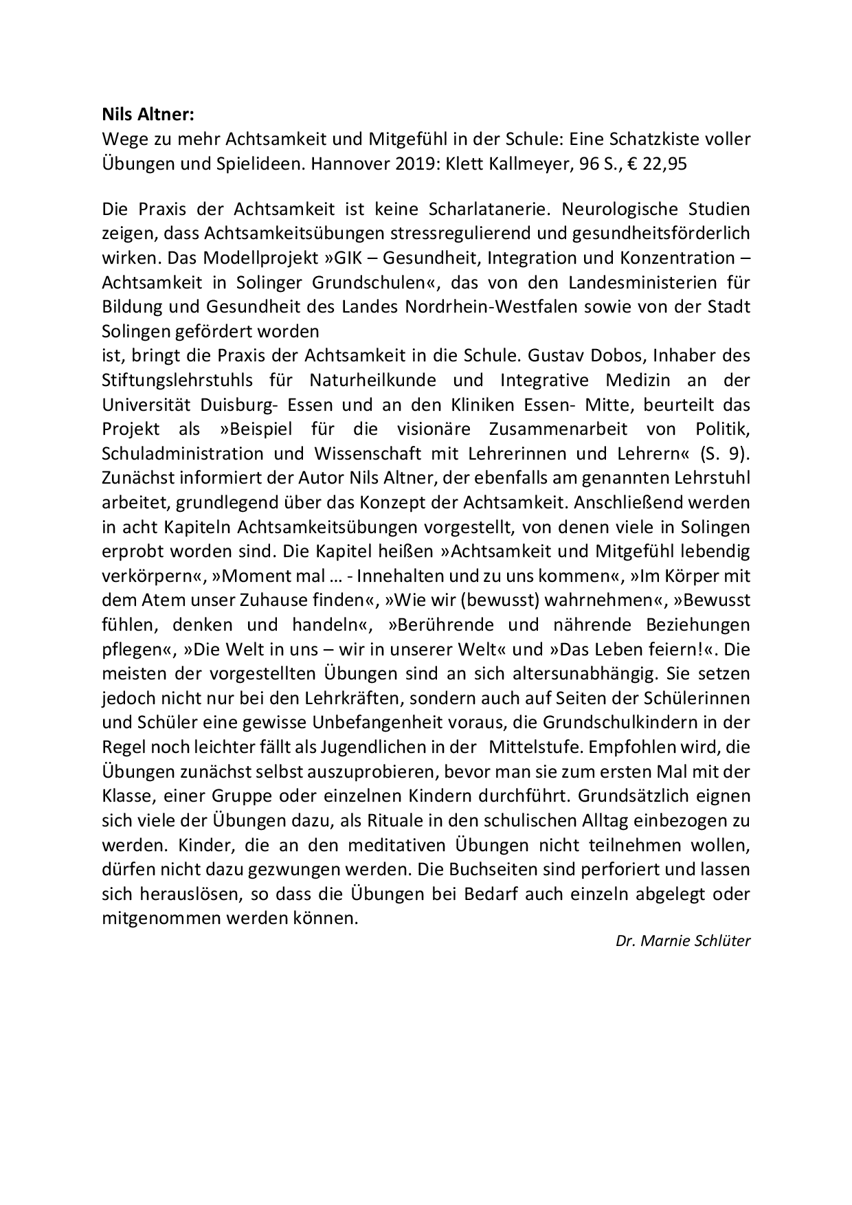 »Mit dem Landesmodellprojekt ›GIK – Gesundheit, Integration und Konzentration – Achtsamkeit in der Schule‹ wurden die Erkenntnisse der modernen Mind-Body-Medizin, wie sie an den Kliniken Essen-Mitte und der Universität Duisburg-Essen für die Behandlung von Patientinnen, Patienten und für Präventionsprogramme genutzt und wissenschaftlich erforscht wurden, erstmalig im schulischen Rahmen angewendet. Dieses von den Landesministerien für Bildung und für Gesundheit in NRW sowie von der Stadt Solingen geförderte interdisziplinäre Projekt zeigt, dass es Lehrkräften im Schulalltag gelingen kann, bewusst eine achtsame, d. h. offene, zugewandte, nicht- abwertende, präsente Haltung zu kultivieren. Damit einher gingen weniger Stressbelastung durch mehr Selbstregulation und Erholung. Bei den Kindern verbesserten sich die Freude am Lernen, die Lernbereitschaft und das Klassenklima. Einige Schulen nutzten die Impulse für die Stärkung einer demokratischen Bildungskultur.«