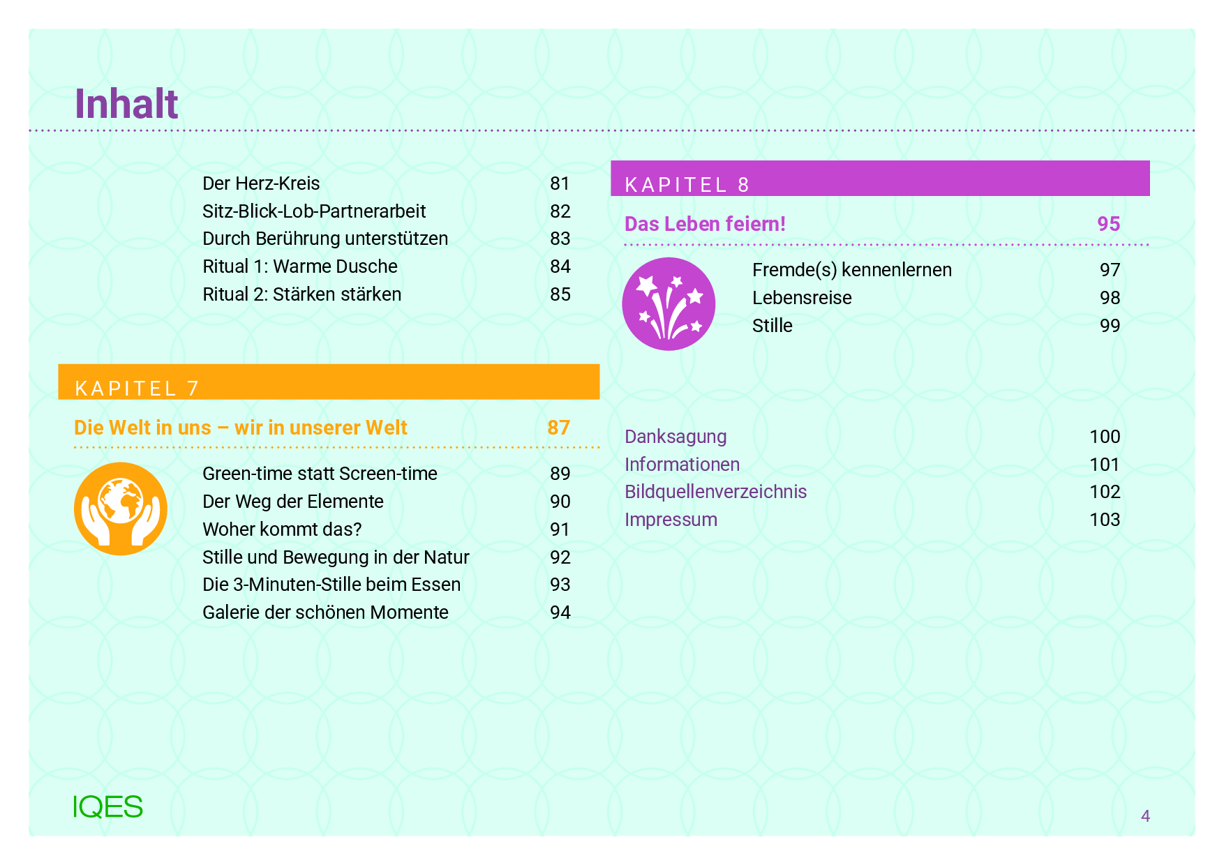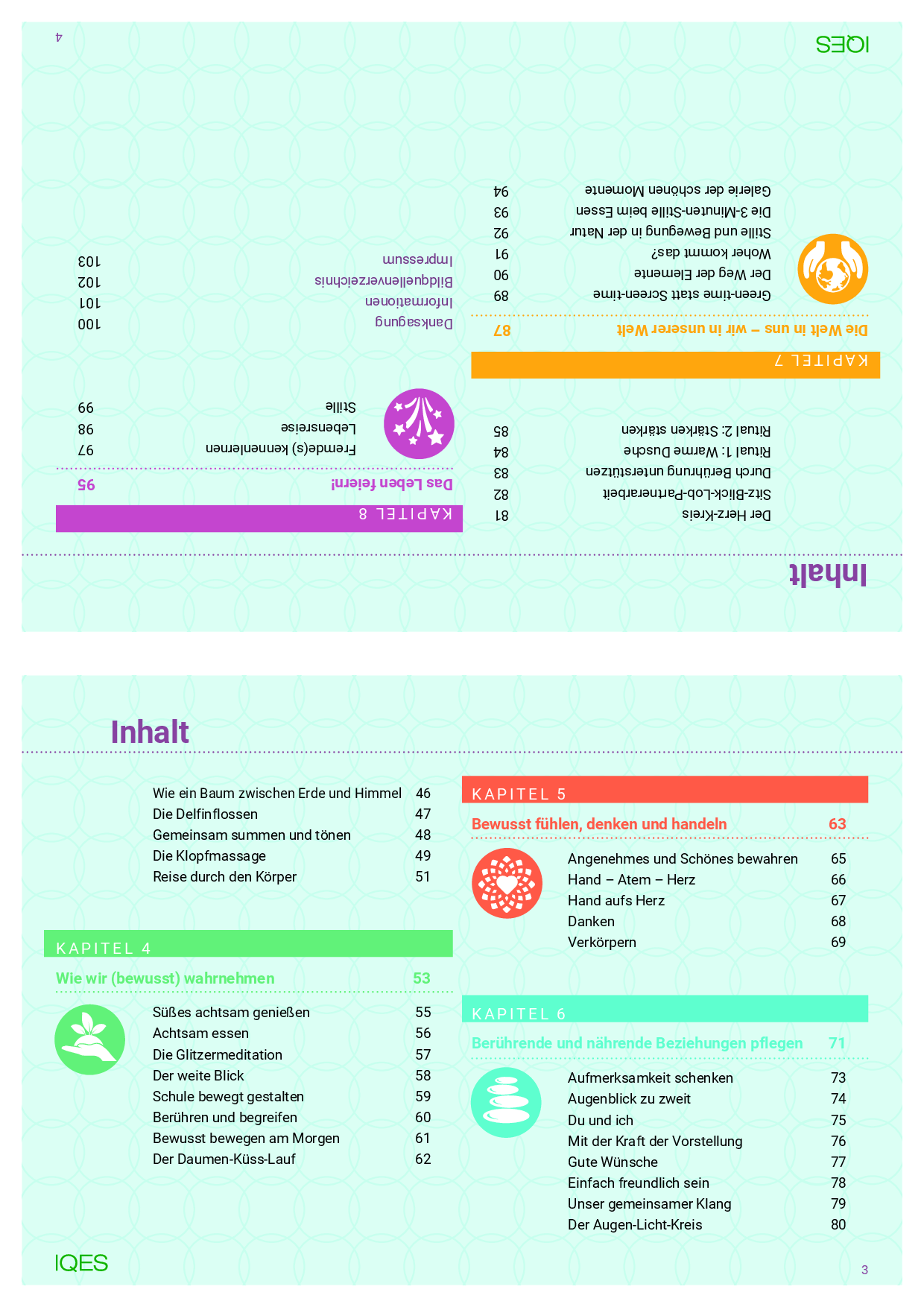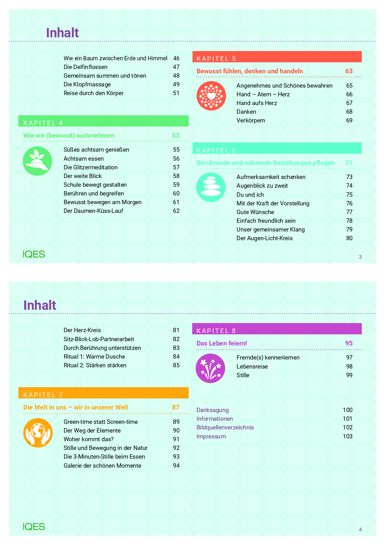 Aufmerksamkeit schenken | Augenblick zu zweit | Du und ich | Mit der Kraft der Vorstellung | Gute Wünsche | Einfach freundlich sein | Unser gemeinsamer Klang | Der Augen-Licht-Kreis | Der Herz-Kreis | Sitz-Blick-Lob-Partnerarbeit | Durch Berührung unterstützen | Ritual 1: Warme Dusche | Ritual 2: Stärken stärken |