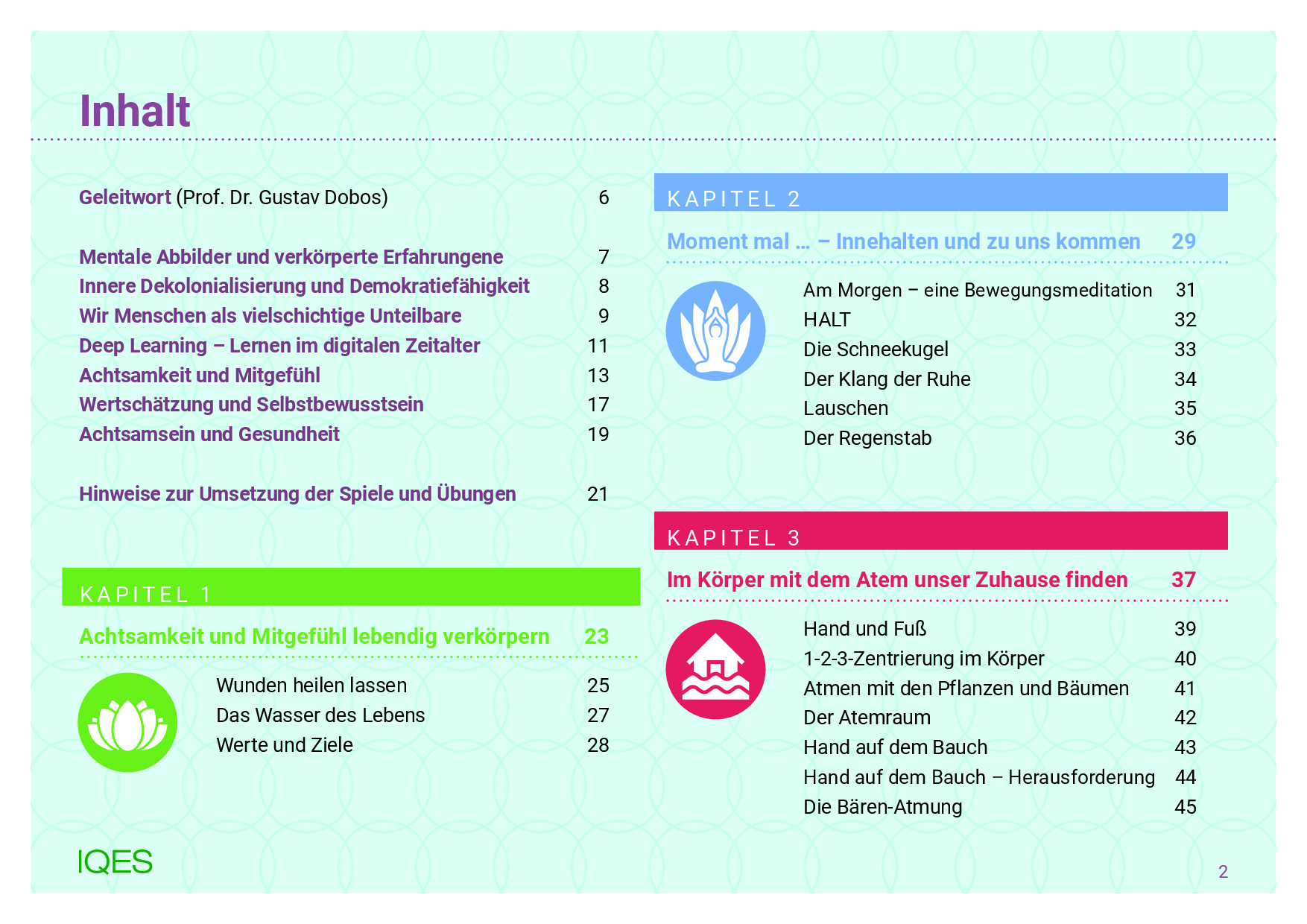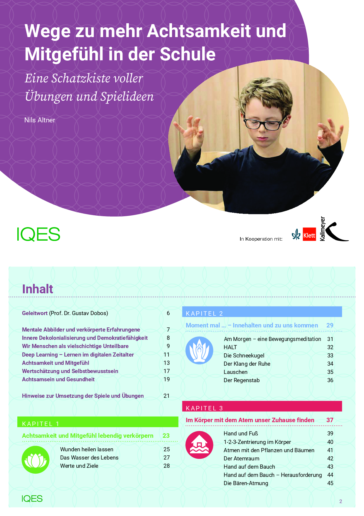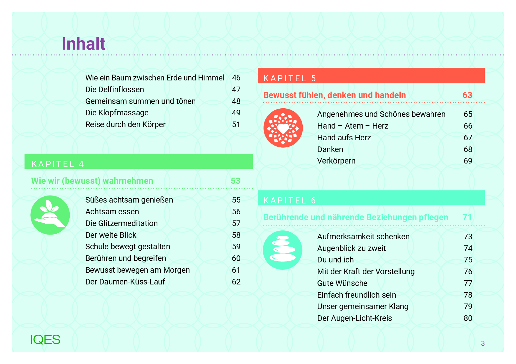 Aufmerksamkeit schenken | Augenblick zu zweit | Du und ich | Mit der Kraft der Vorstellung | Gute Wünsche | Einfach freundlich sein | Unser gemeinsamer Klang | Der Augen-Licht-Kreis | Der Herz-Kreis | Sitz-Blick-Lob-Partnerarbeit | Durch Berührung unterstützen | Ritual 1: Warme Dusche | Ritual 2: Stärken stärken |