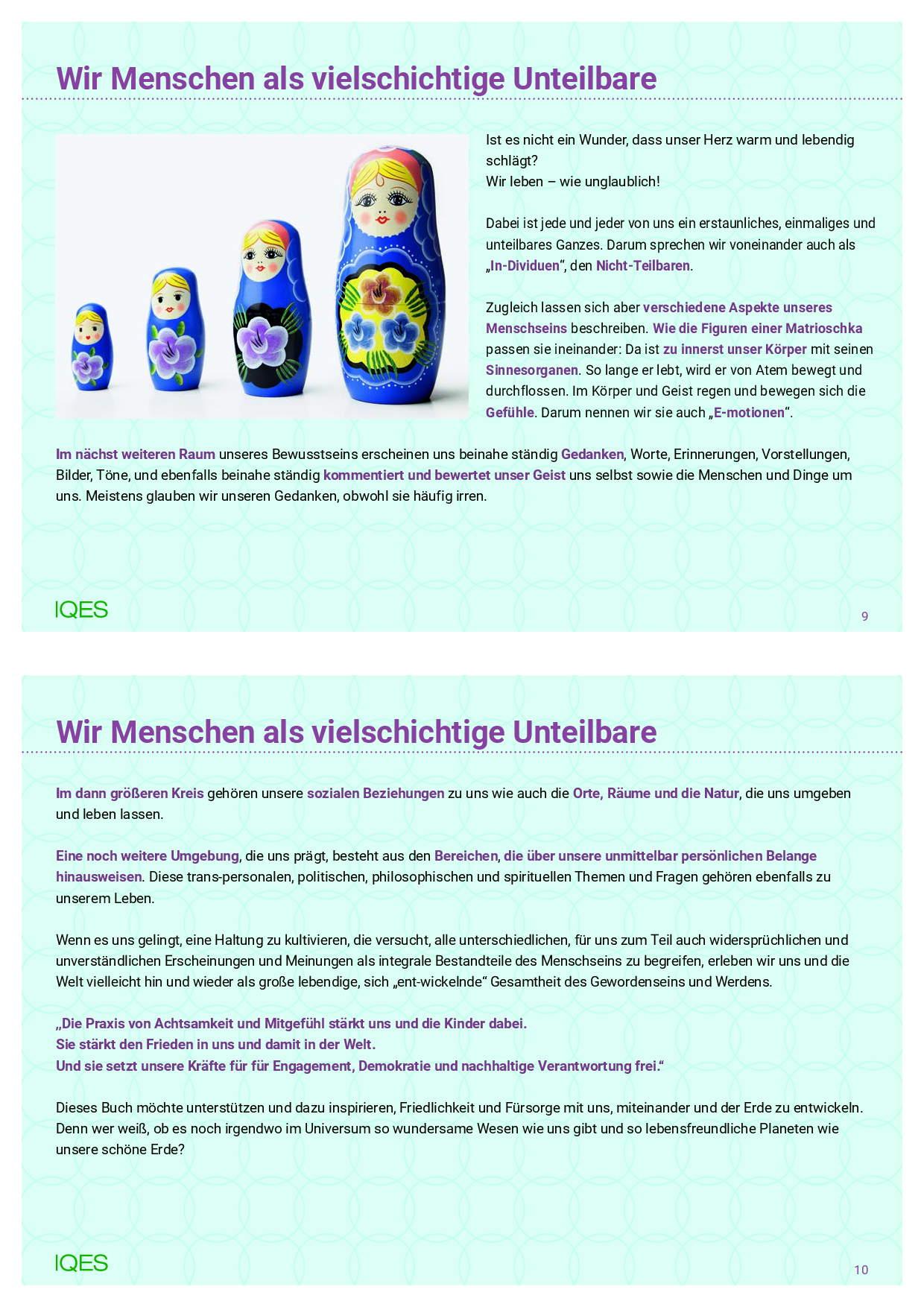 Mit der Umsetzung der Übungen und Spiele in dieser Publikation fördern wir die Fähigkeiten für eine stressmindernde und gesundheitsfördernde Selbstregulation bei uns Lehrenden und auch bei den Schülern und Schülerinnen, die sich darauf einlassen mögen. Diese schönen Wirkungen beruhen auf der Verkörperung einer achtsamem, (selbst-)fühlendem und fürsorglichen Haltung im Bildungsalltag. Wenn wir z. B. mit dem bewussten Lauschen, Schauen oder Atmen immer mal wieder uns selbst in der Beziehung zu den Menschen und zu der Welt um uns spüren und sein lassen, treten unsere Vorstellungen, Meinungen und Erwartungen an die Wirklichkeit zurück. Die Praxis von Achtsamkeit und Mitgefühl stärkt uns und die Kinder dabei. Sie stärkt den Frieden in uns und damit in der Welt. Und sie setzt unsere Kräfte für Engagement, Demokratie und nachhaltige Verantwortung frei.