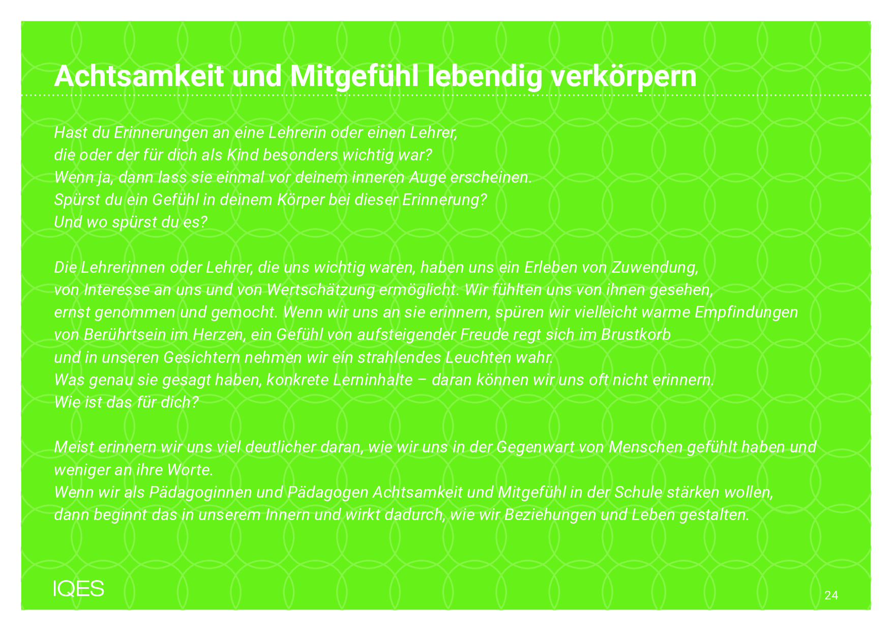 Wenn wir als Pädagoginnen und Pädagogen Achtsamkeit und Mitgefühl in der Schule stärken wollen, dann beginnt das in unserem Innern und wirkt dadurch, wie wir Beziehungen und Leben gestalten.
