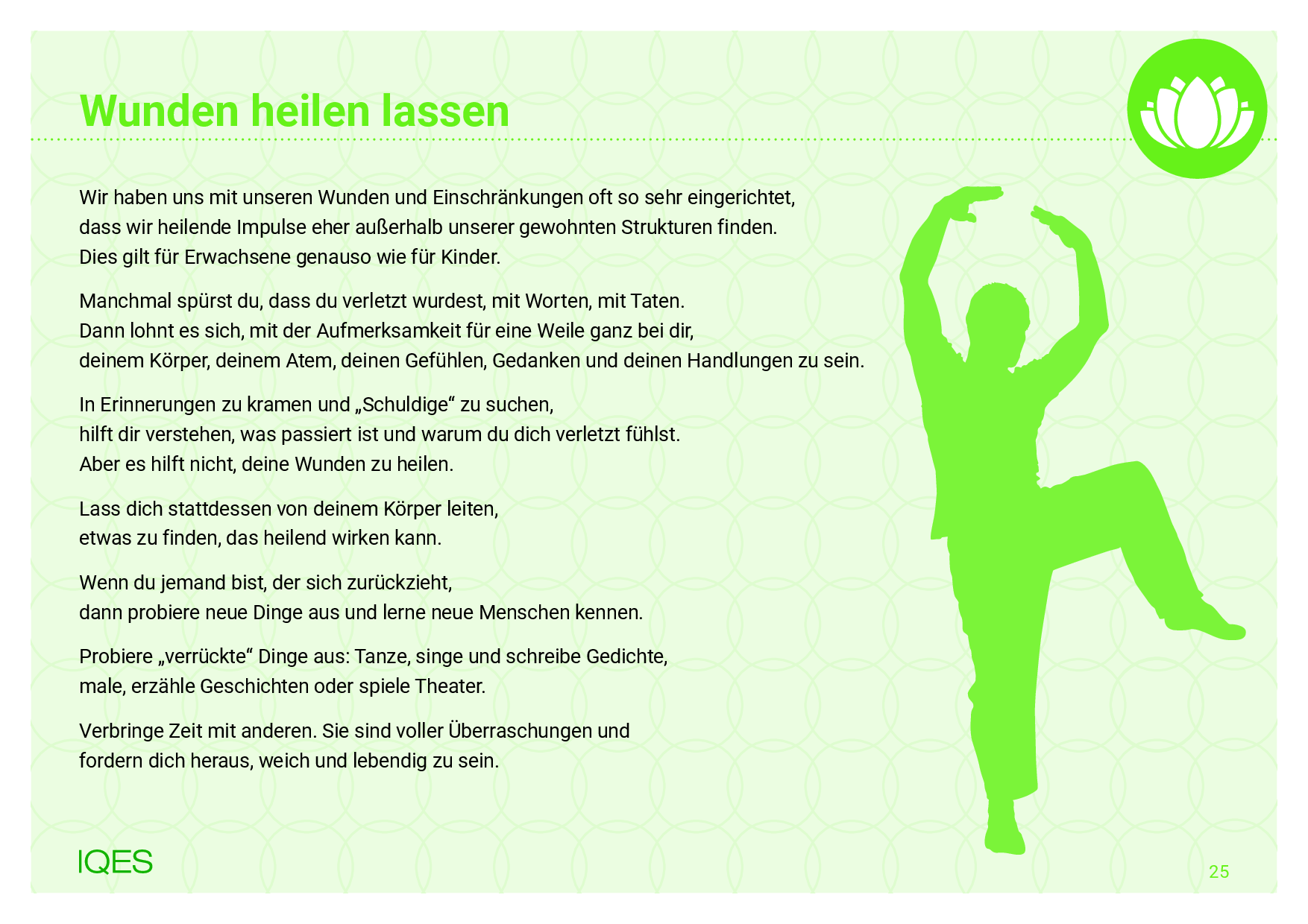 Übungen und Spielideen: 1) Wunden heilen lassen, 2) Das Wasser des Lebens, 3) Werte und Ziele