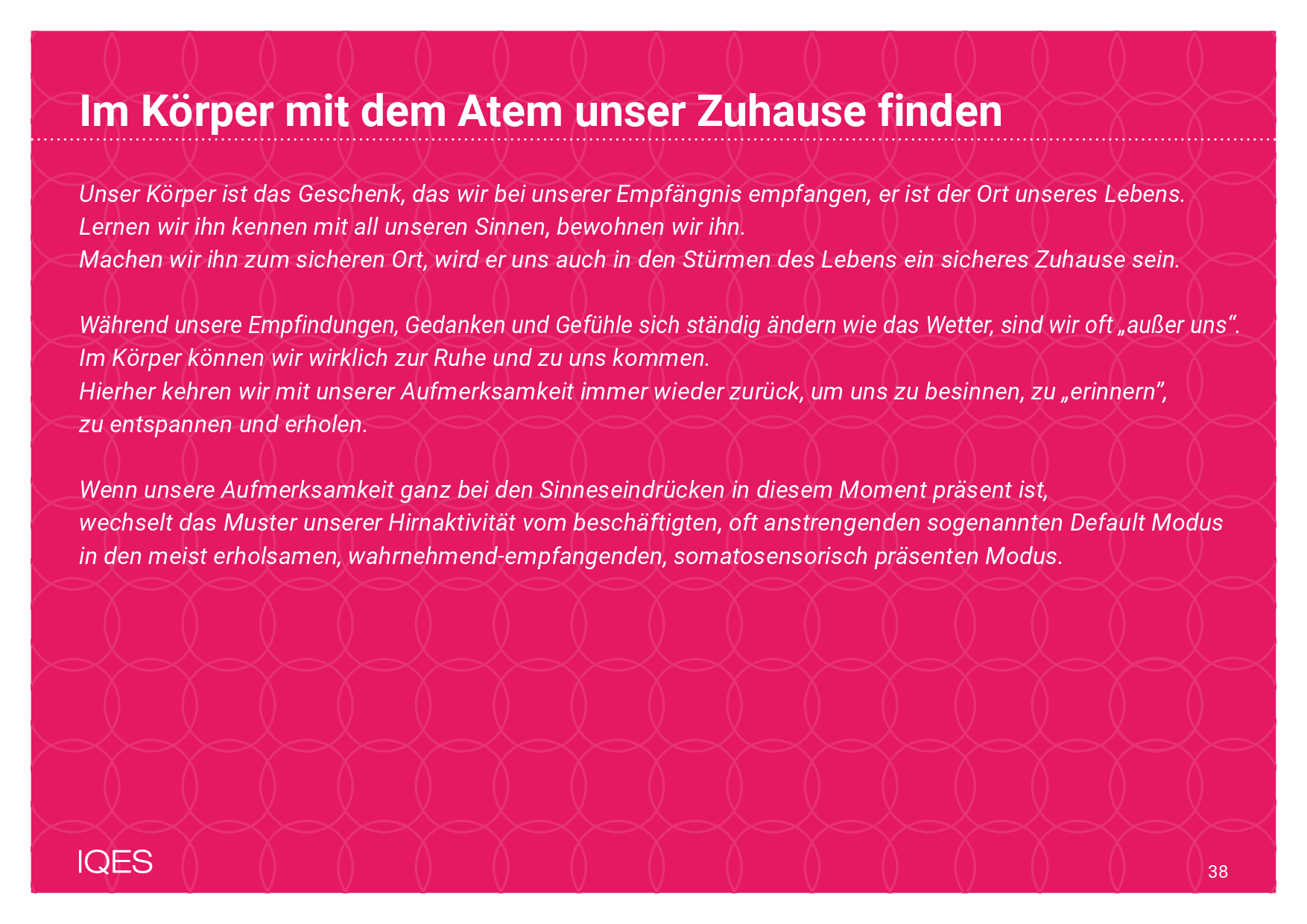 Wenn unsere Aufmerksamkeit ganz bei den Sinneseindrücken in diesem Moment präsent ist, wechselt das Muster unserer Hirnaktivität vom beschäftigten, oft anstrengenden sogenannten Default Modus in den meist erholsamen, wahrnehmend-empfangenden, somatosensorisch präsenten Modus.