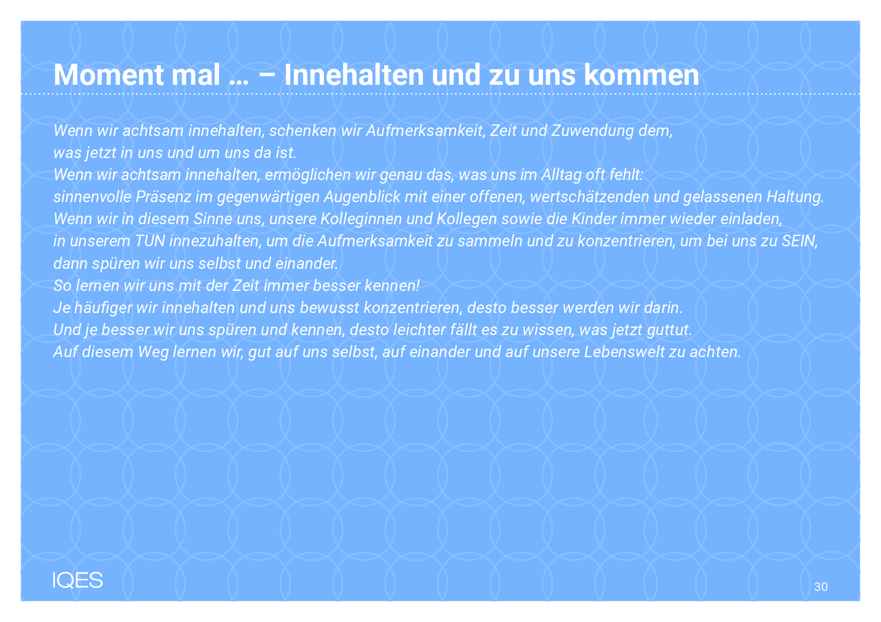 Wenn wir in diesem Sinne uns, unsere Kolleginnen und Kollegen sowie die Kinder immer wieder einladen, in unserem TUN innezuhalten, um die Aufmerksamkeit zu sammeln und zu konzentrieren, um bei uns zu SEIN, dann spüren wir uns selbst und einander.