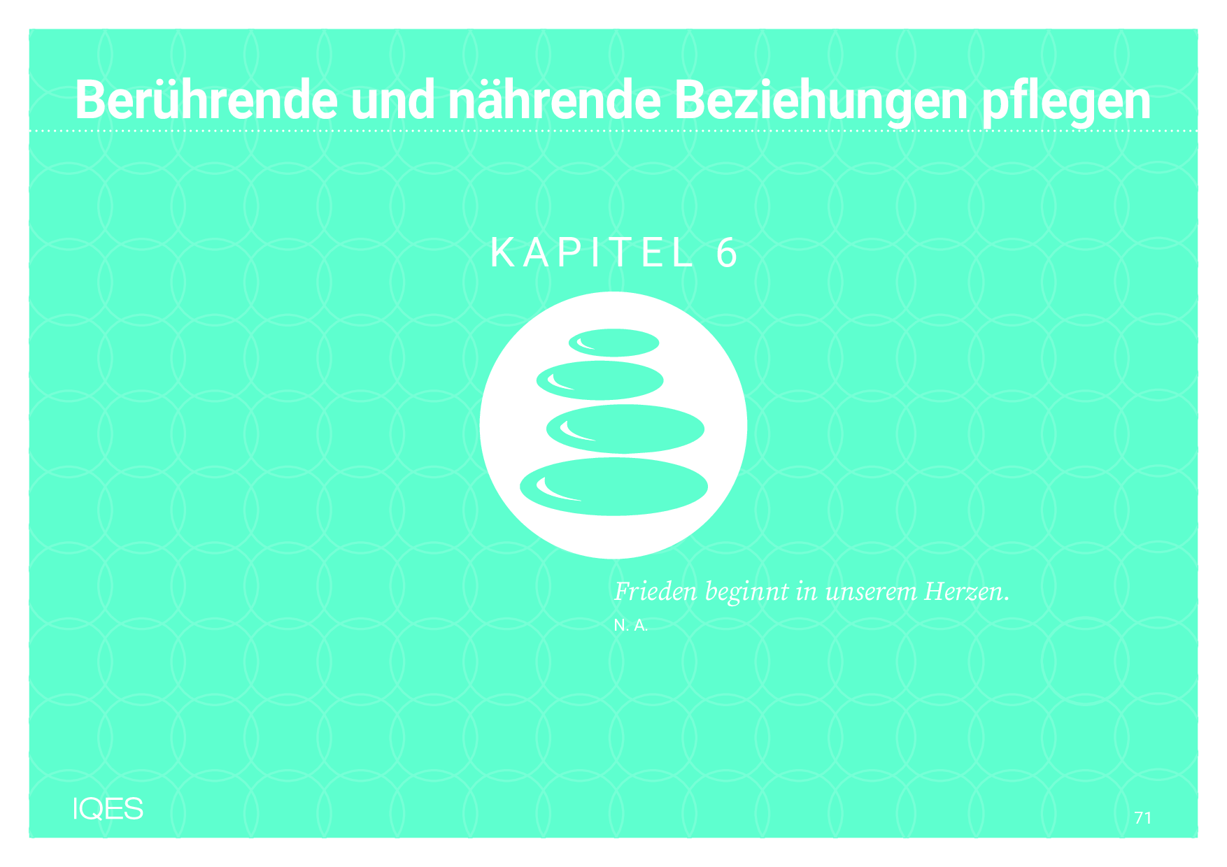 Übungen und Spielideen: 35) Aufmerksamkeit schenken, 36) Augenblick zu zweit, 37) Du und ich, 38) Mit der Kraft der Vorstellung, 39) Gute Wünsche, 40) Einfach freundlich sein, 41) Unser gemeinsamer Klang, 42) Der Augen-Licht-Kreis, 43) Der Herz-Kreis, 44) Sitz-Blick-Lob-Partnerarbeit, 45) Durch Berührung unterstützen, 46) Ritual 1: Warme Dusche, 47) Ritual 2: Stärken stärken