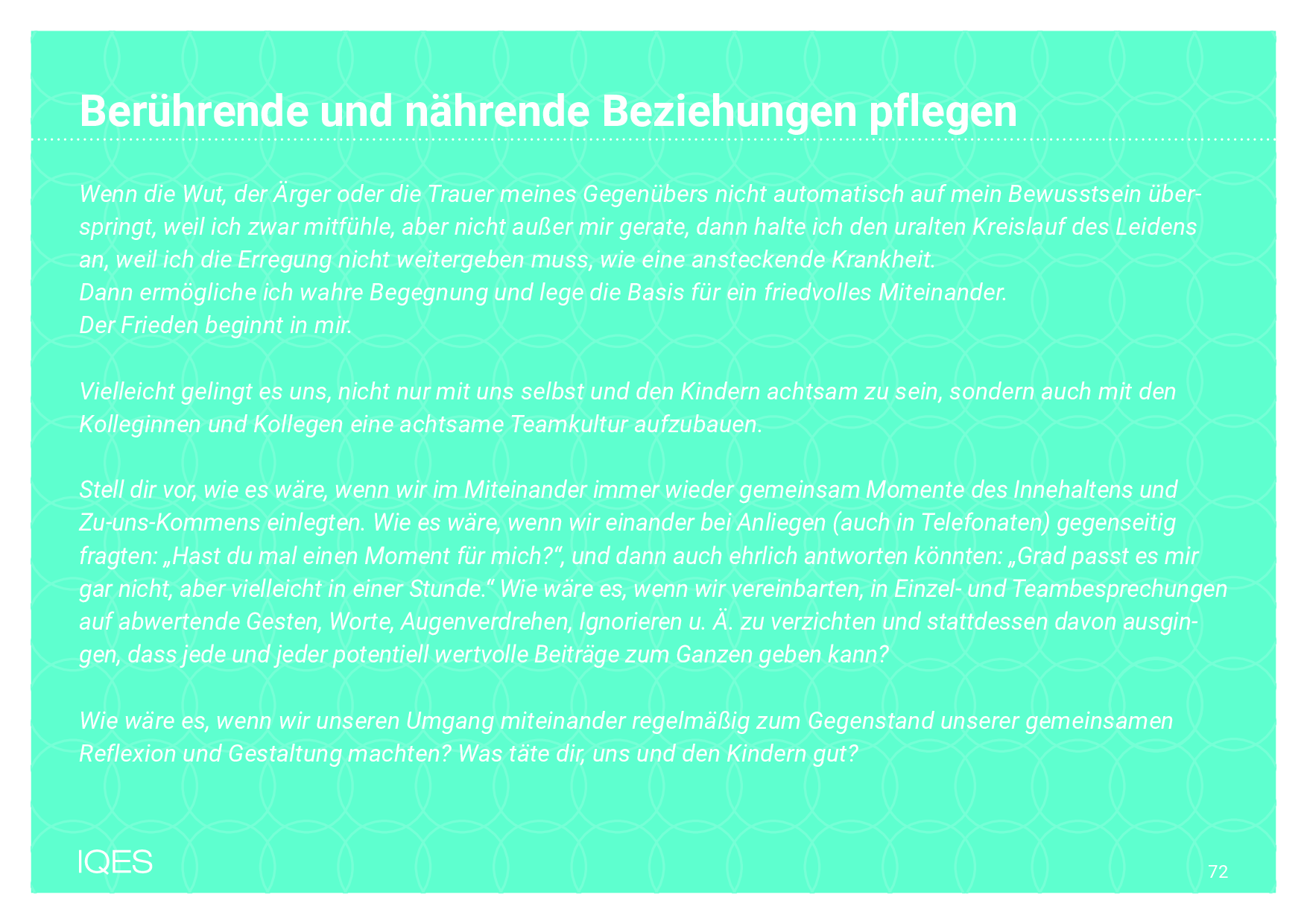 Vielleicht gelingt es uns, nicht nur mit uns selbst und den Kindern achtsam zu sein, sondern auch mit den Kolleginnen und Kollegen eine achtsame Teamkultur aufzubauen.