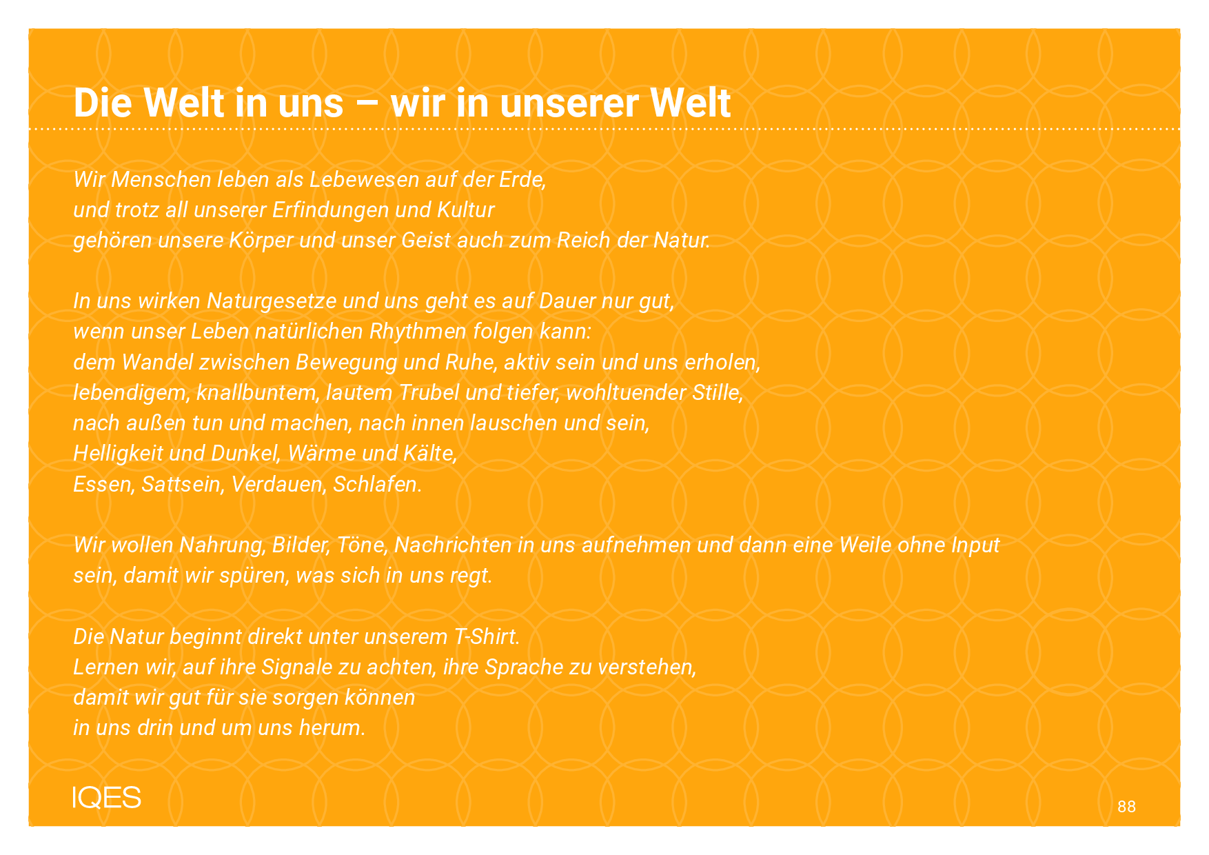 Wir Menschen leben als Lebewesen auf der Erde, und trotz all unserer Erfindungen und Kultur gehören unsere Körper und unser Geist auch zum Reich der Natur. In uns wirken Naturgesetze und uns geht es auf Dauer nur gut, wenn unser Leben natürlichen Rhythmen folgen kann: dem Wandel zwischen Bewegung und Ruhe, aktiv sein und uns erholen, lebendigem, knallbuntem, lautem Trubel und tiefer, wohltuender Stille, nach außen tun und machen, nach innen lauschen und sein, Helligkeit und Dunkel, Wärme und Kälte, Essen, Sattsein, Verdauen, Schlafen.