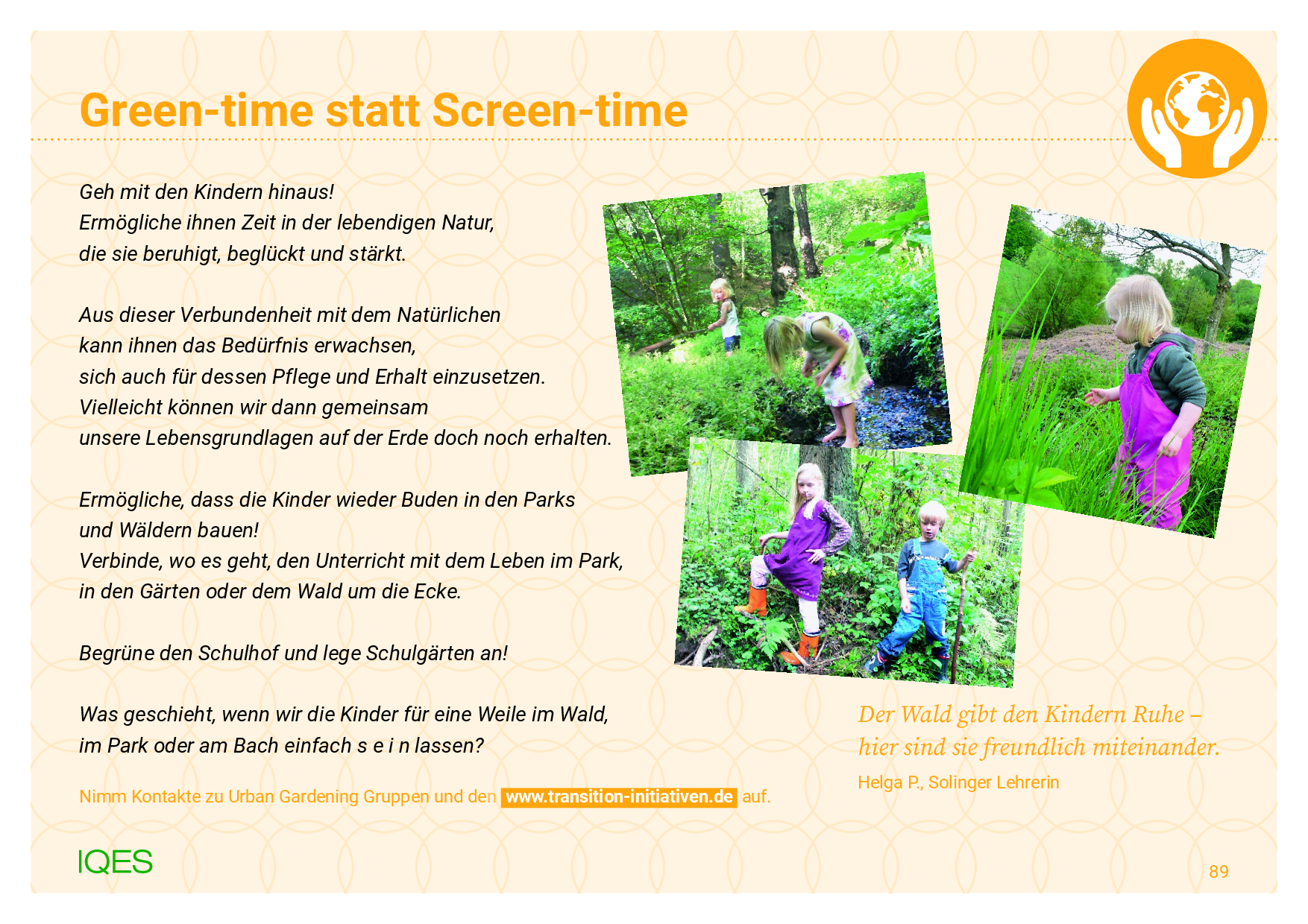 Übungen und Spielideen: 48) Green-time statt Screen-time, 49) Der Weg der Elemente, 50) Woher kommt das? 51) Stille und Bewegung in der Natur, 52) Die 3-Minuten-Stille beim Essen, 53) Galerie der schönen Momente