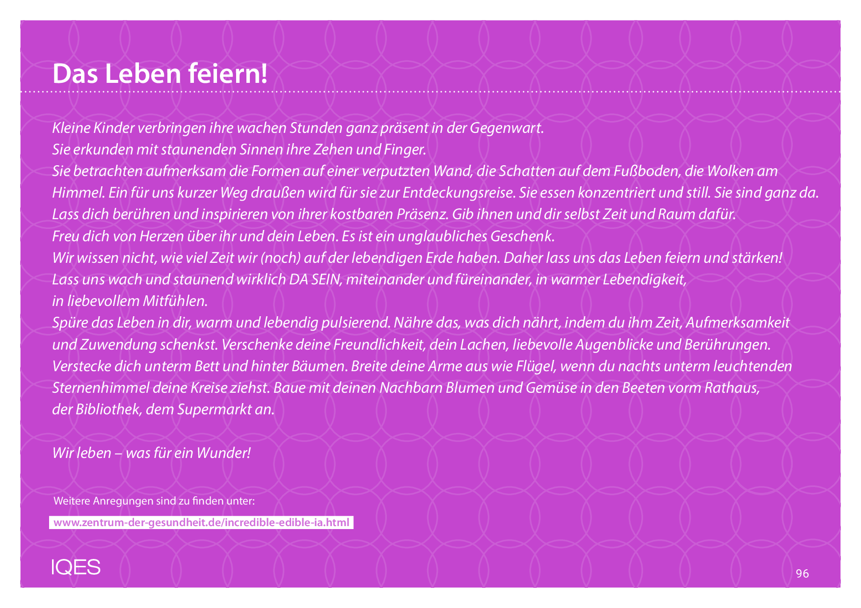 Spüre das Leben in dir, warm und lebendig pulsierend. Nähre das, was dich nährt, indem du ihm Zeit, Aufmerksamkeit und Zuwendung schenkst. Verschenke deine Freundlichkeit, dein Lachen, liebevolle Augenblicke und Berührungen.