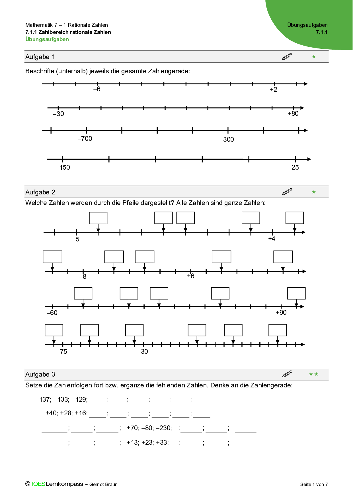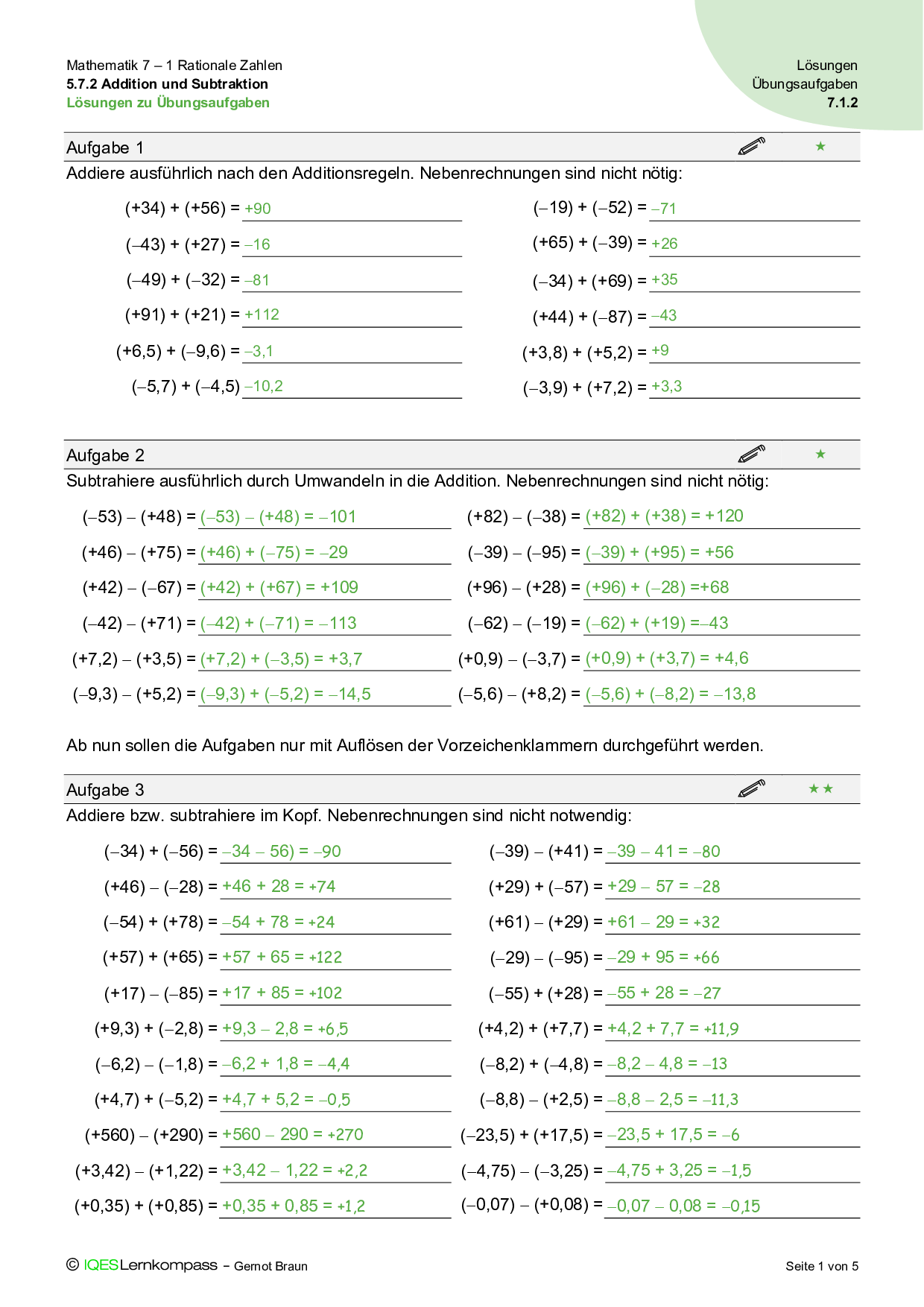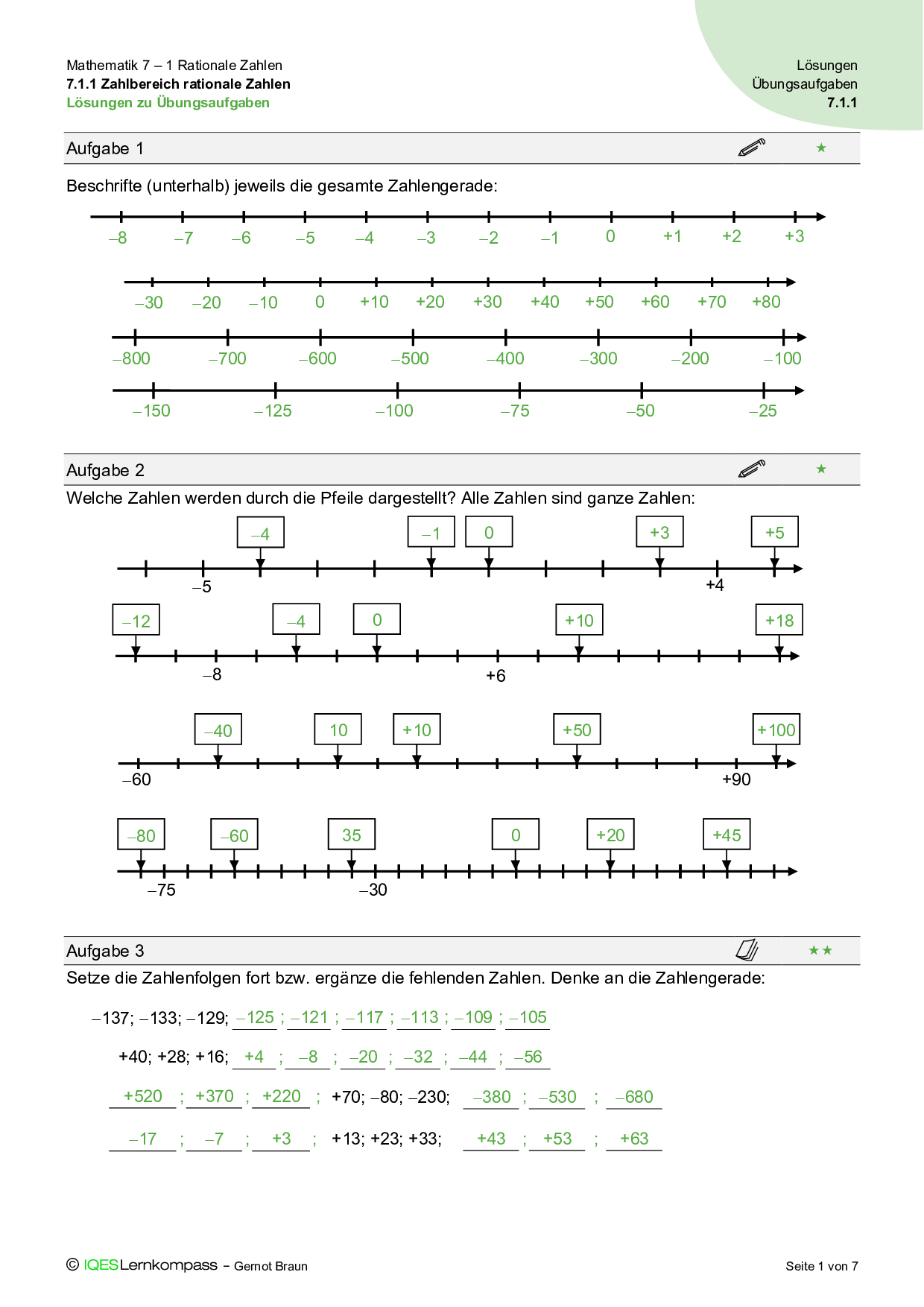 7.1.1 Zahlbereich rationale Zahlen – Übungsaufgaben mit Lösungen