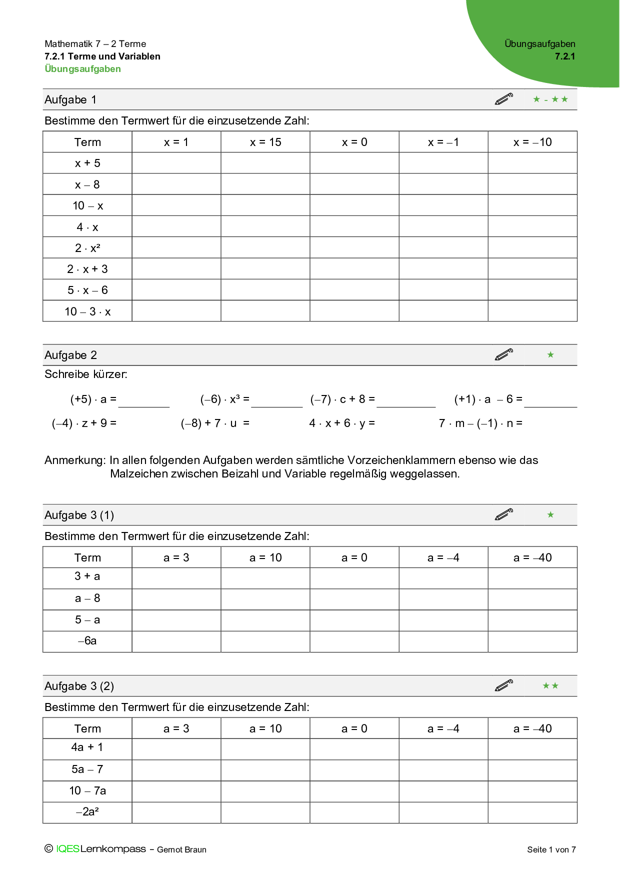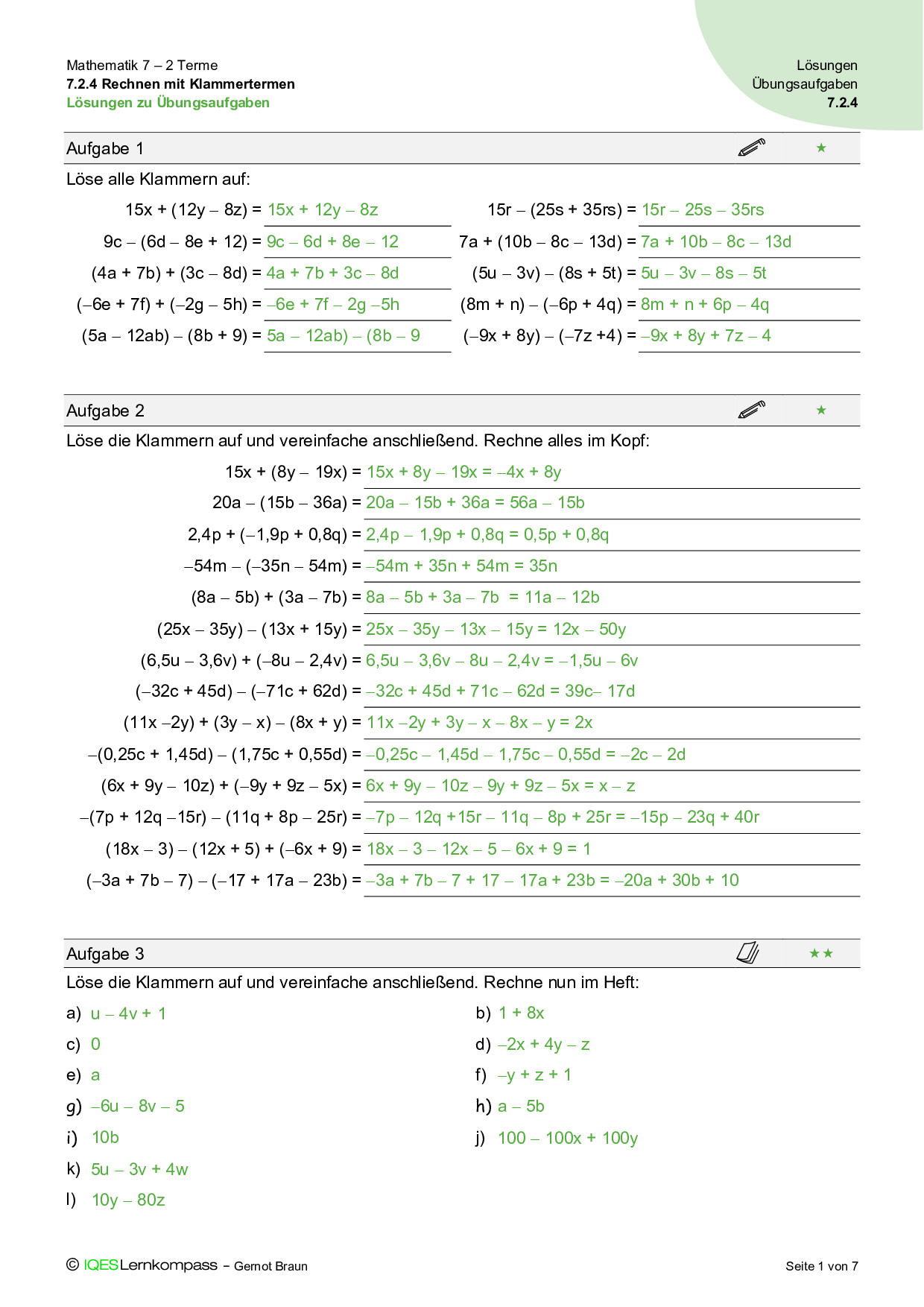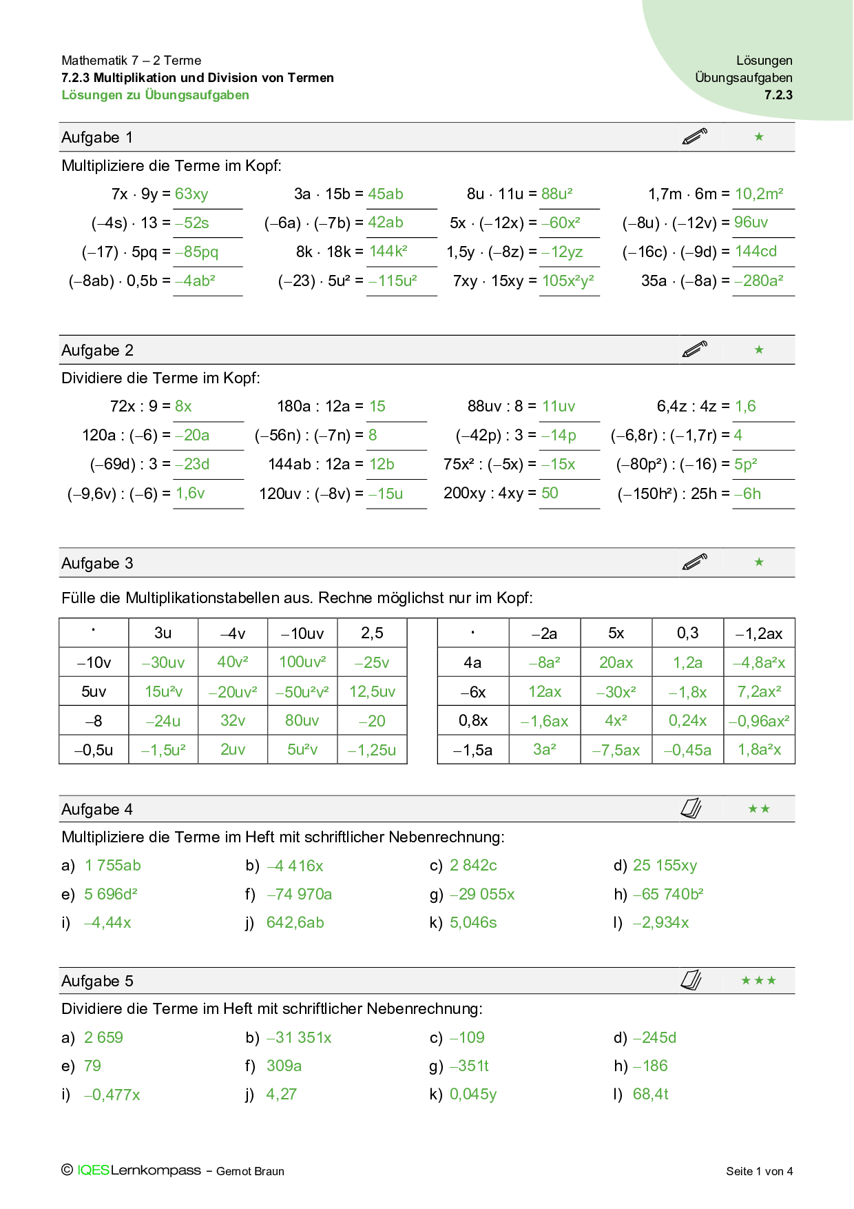 7.2.3 Multiplikation und Division von Termen – Übungsaufgaben mit Lösungen
