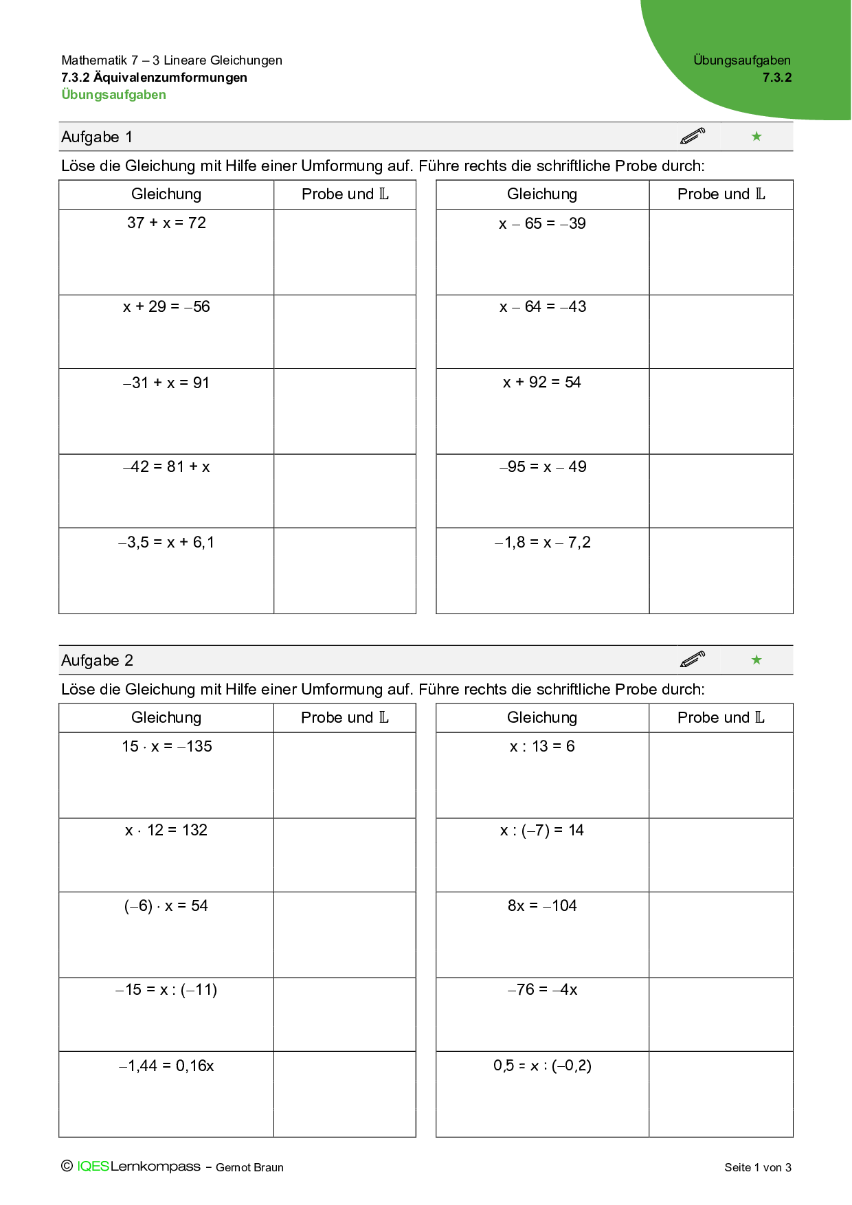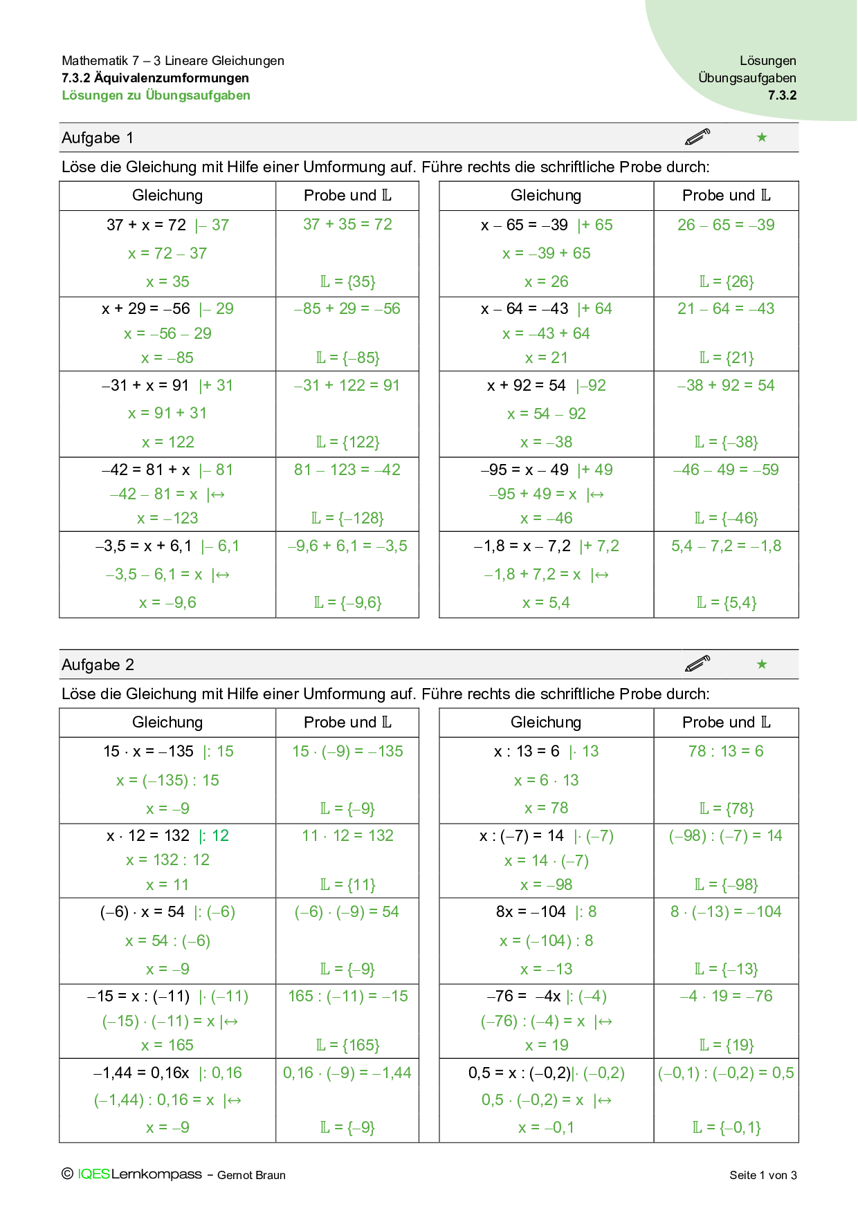 7.3.2 Äquivalenzumformungen – Übungsaufgaben mit Lösungen