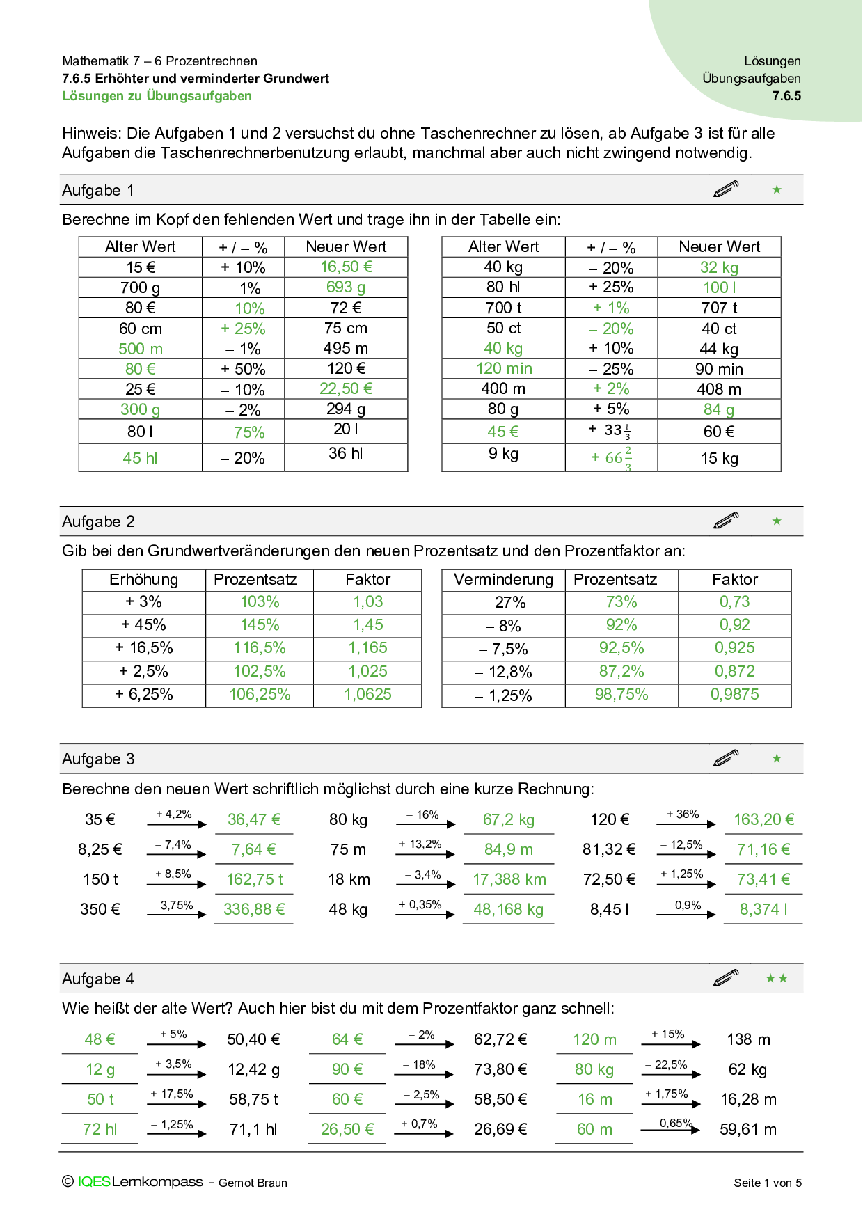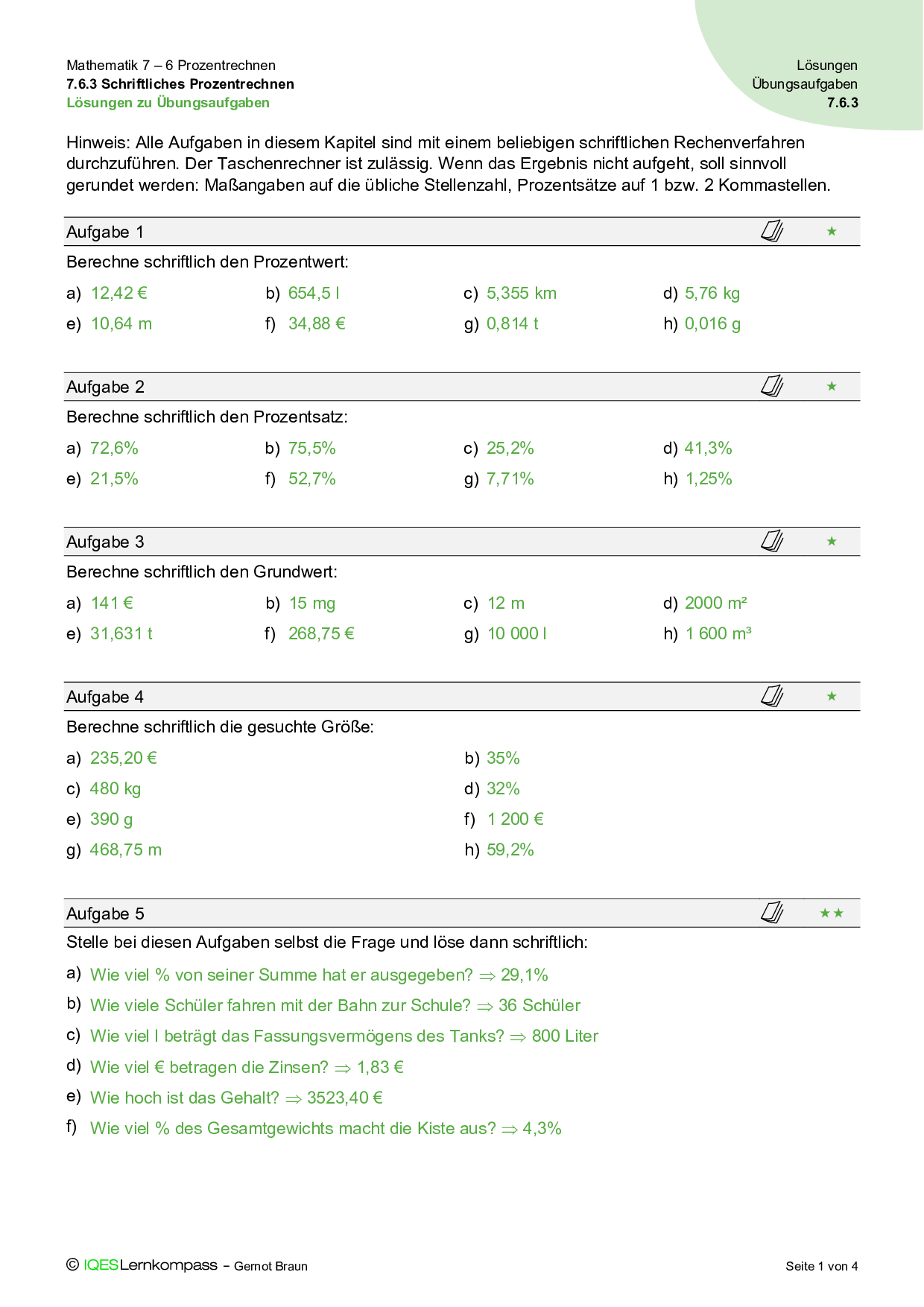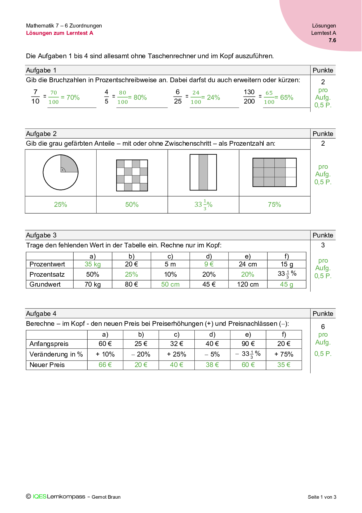 7.6 Prozentrechnen – Lösungen zum Aufgabenpool für Abschlusstests