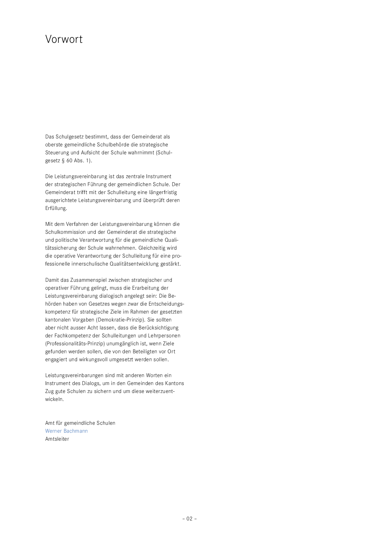 In dieser Broschüre werden Leistungsvereinbarungen und Controlling im Kanton Zug behandelt. Im Fokus stehen Verfahren und Instrumente für die strategische Führung durch Gemeinderat und Schulkommission. Es geht darum, gute Schulen zu sichern und um diese weiterzuentwickeln.