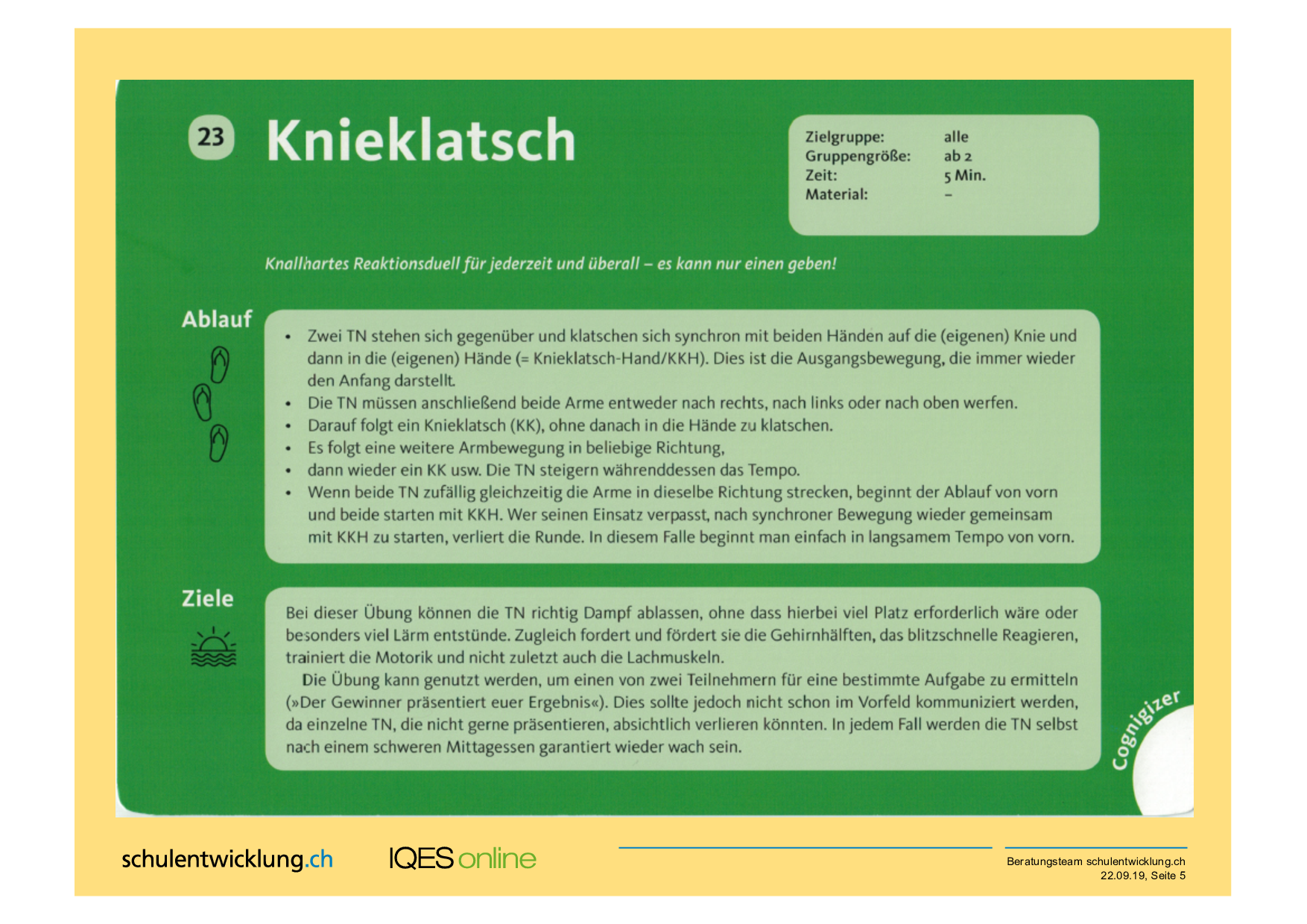 Die TN kennen Übungen, bei denen man mit der einen Hand auf den Kopf klopft und mit der anderen über den Bauch kreist. Dies ist eine noch eher unbekannte Alternative mit selbem Effekt: Die TN stoßen an ihre koordinativen Grenzen, sind hiermit jedoch nicht allein, und erfahren dennoch zugleich, dass ein geduldiges Training seine Wirkung mit sich bringt. Dies lässt sich auf viele Lernsituationen übertragen – insbesondere dann, wenn es um den Auf- und Ausbau von Handlungskompetenz geht. Eine weitere Reflexionsebene wird insbesondere in Level 3 deutlich: Unsere linke Gehirnhälfte koordiniert die rechte Körperseite und umgekehrt. Daher fällt es uns so schwer, zwei entgegengesetzte Bewegungen auf einer Körperseite durchzuführen. Es wird deutlich einfacher, wenn die TN die Hand wechseln und nun testhalber einmal den linken Zeigefinger gegen den Uhrzeigersinn rotieren lassen.