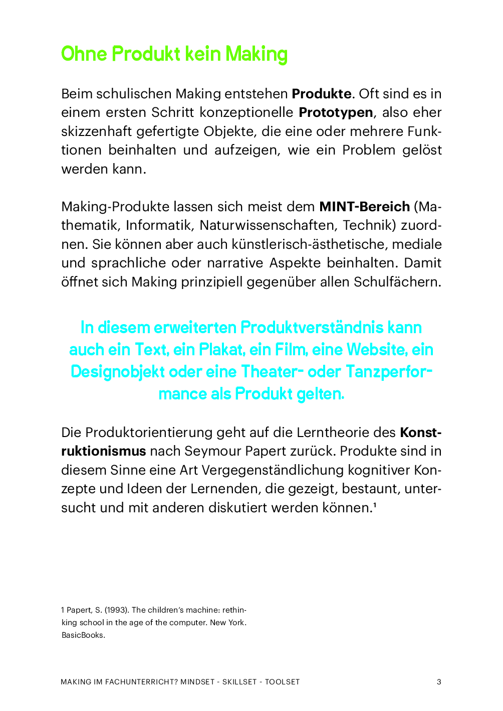 Während im herkömmlichen Unterricht Prüfungen den Abschluss einer Einheit markieren, plädieren die beiden Autoren für Leistungsüberprüfungen in Form von Produkten: diese werden nach der Fertigstellung in den Unterricht getragen, werden präsentiert, gesichtet, besprochen und evaluiert. Im besten Fall resultiert ein Produkt, das die verdiente Aufmerksamkeit bekommt und der Klasse als echte Lernressource dient. Um Produkte dieser Art herzustellen, brauchen die Schüler*innen konkretes, verfügbares Fachwissen, spezifische Fertigkeiten, Motivation und Durchhaltevermögen. Sie bauen Kompetenzen auf, indem Wissen und Können praktisch angewendet werden: Probleme werden gelöst und die eigenen Lernprozesse dabei bewusst erlebt und gesteuert. Insbesondere sind auch Kompetenzen im Umgang mit digitalen Medien gefragt, weil sich neue Medien besonders gut für die Herstellung, die gemeinsame Bearbeitung und den Austausch von Lernprodukten eignen.