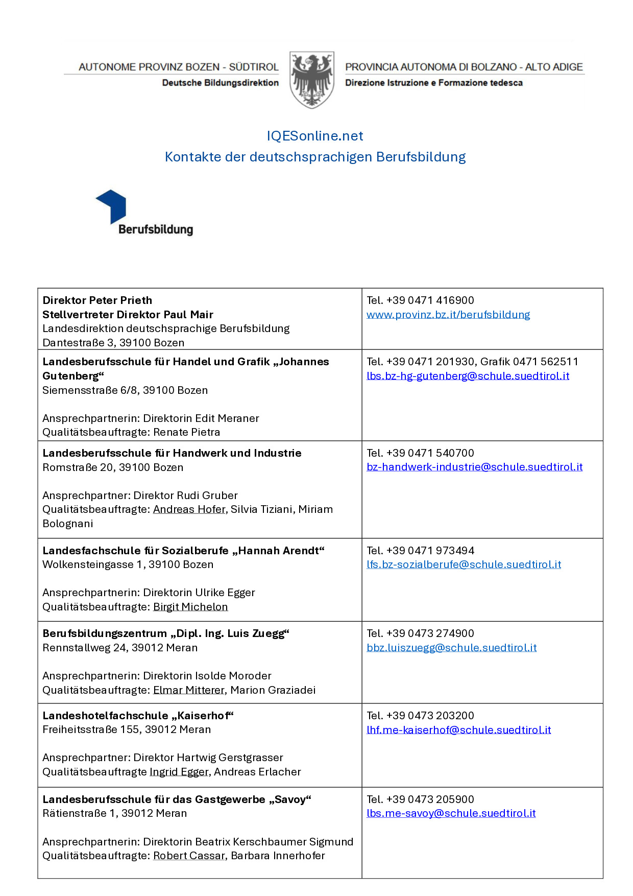 Kontaktliste berufsbildende Schulen Landesdirektion deutschsprachige Berufsbildung Bozen