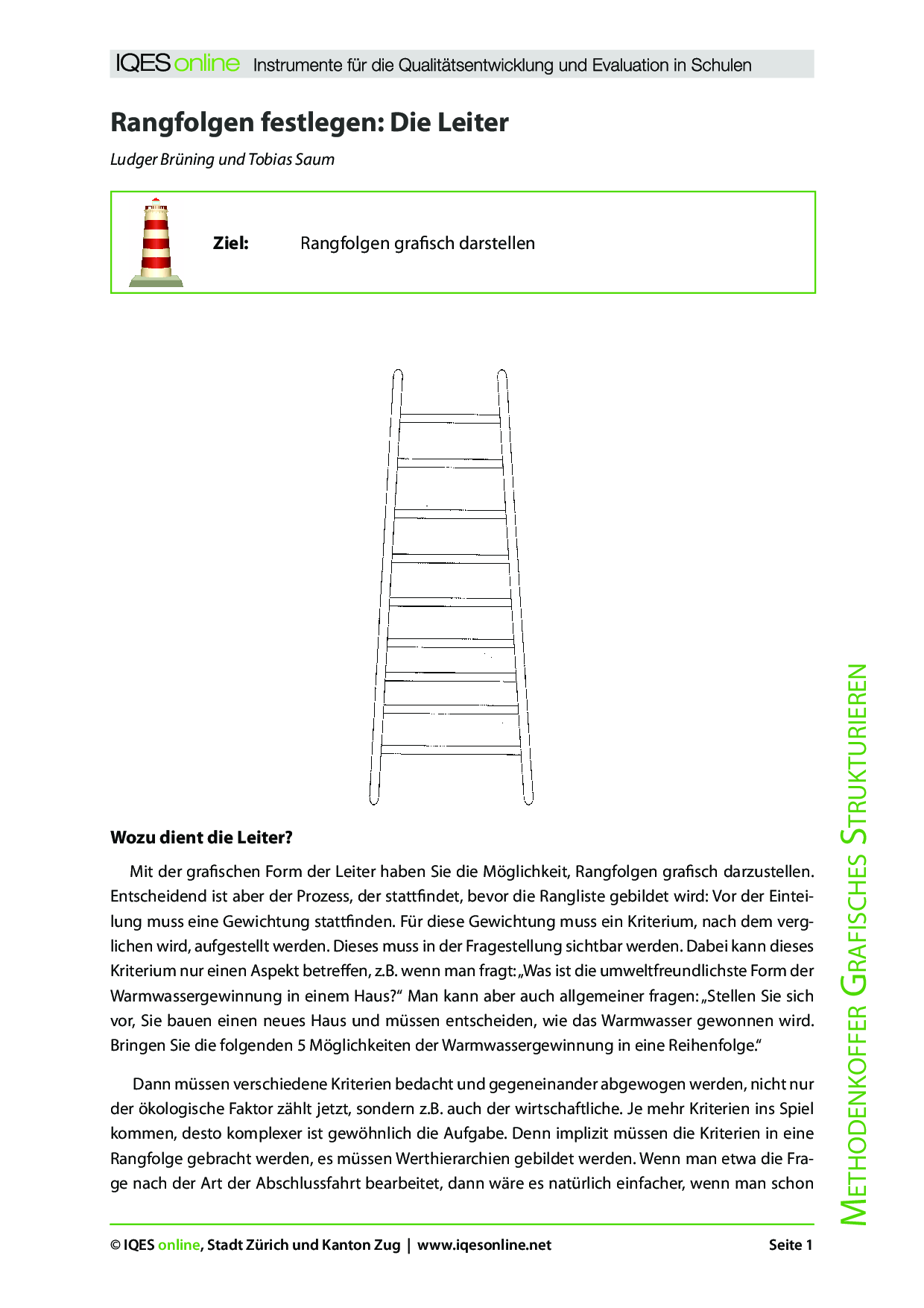 Damit die Schüler lernen, Aspekte zu priorisieren und zu ordnen, kann die Leiter als grafisches Hilfsmittel verwendet werden, wobei festgelegt werden muss, ob die 1. Priorität bei der obersten oder der untersten Sprosse liegt. Im beiliegenden Dokument finden Sie Theorie und ein Beispiel zum Thema.