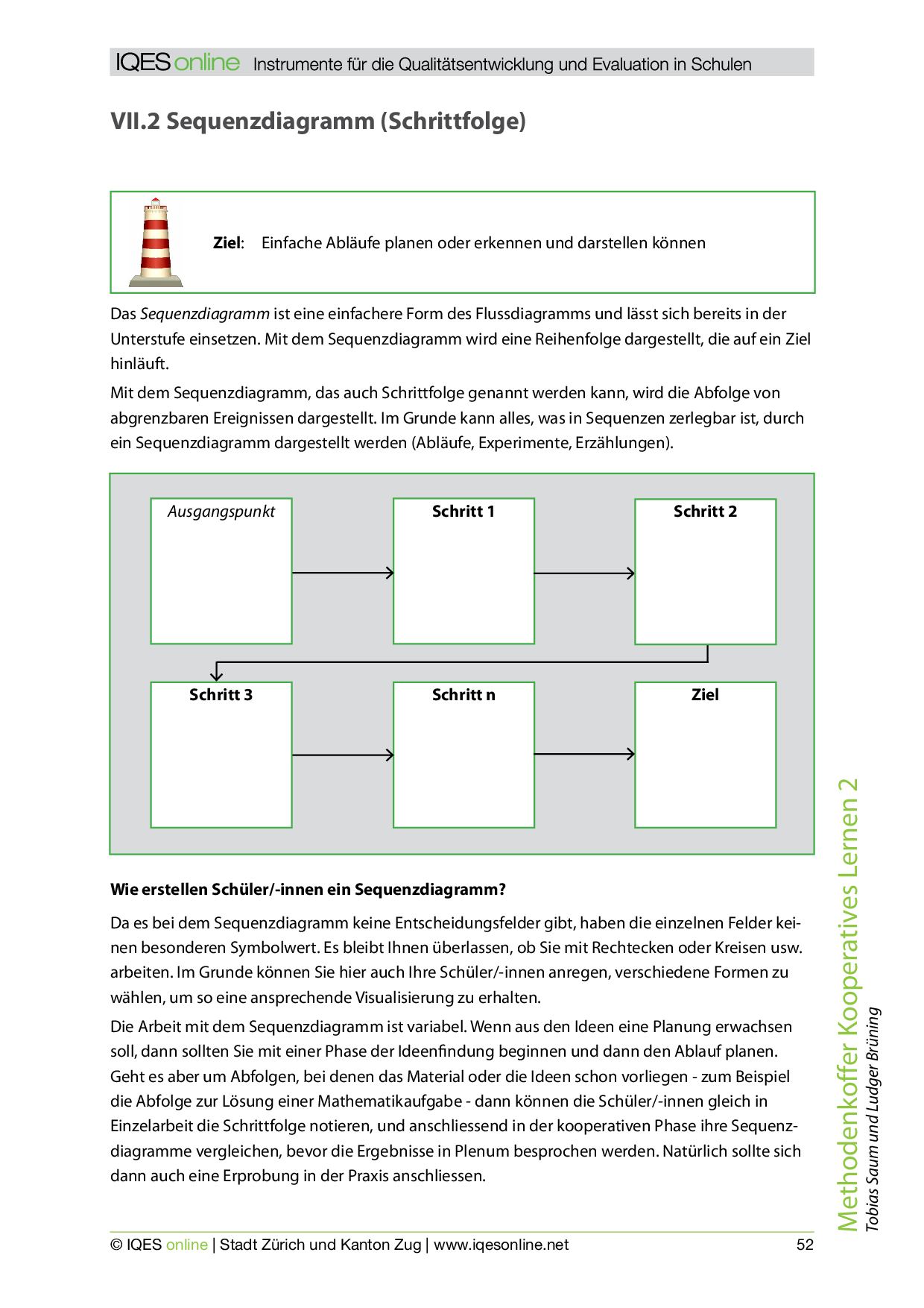 In diesem Dokument wird der Einsatz des Sequenzdiagramms beschrieben. Die Schülerinnen und Schüler lernen damit die Strukturierung oder Zerlegung von Aktionen, Aufgaben, Erzählungen etc. in abgrenzbare Einheiten.
