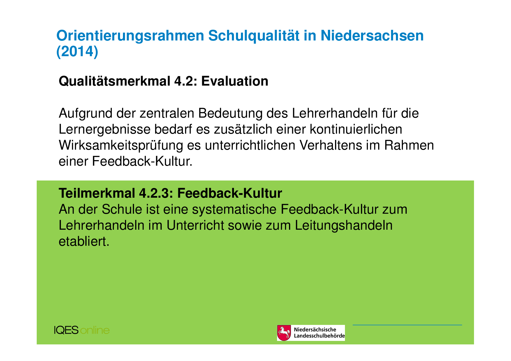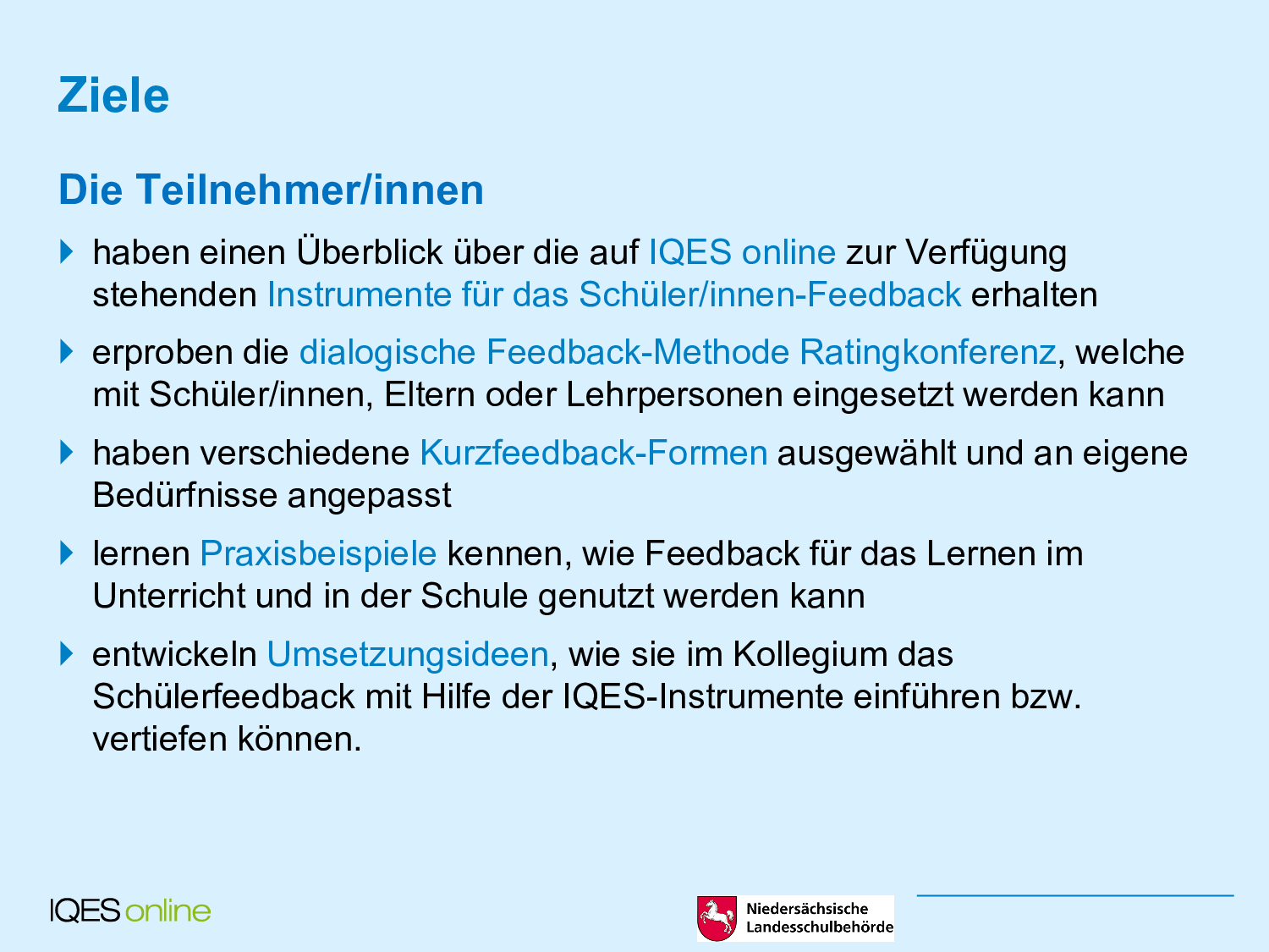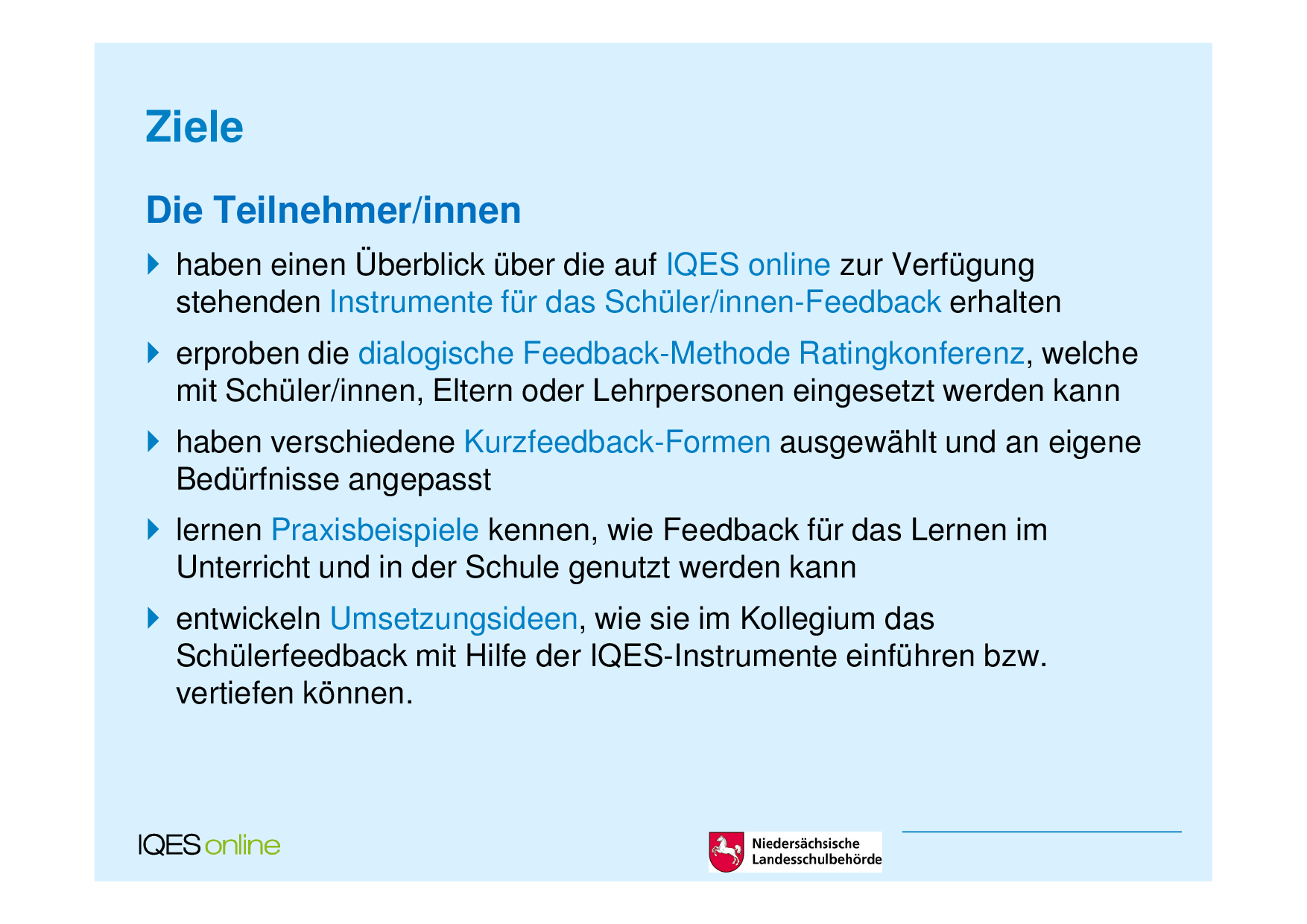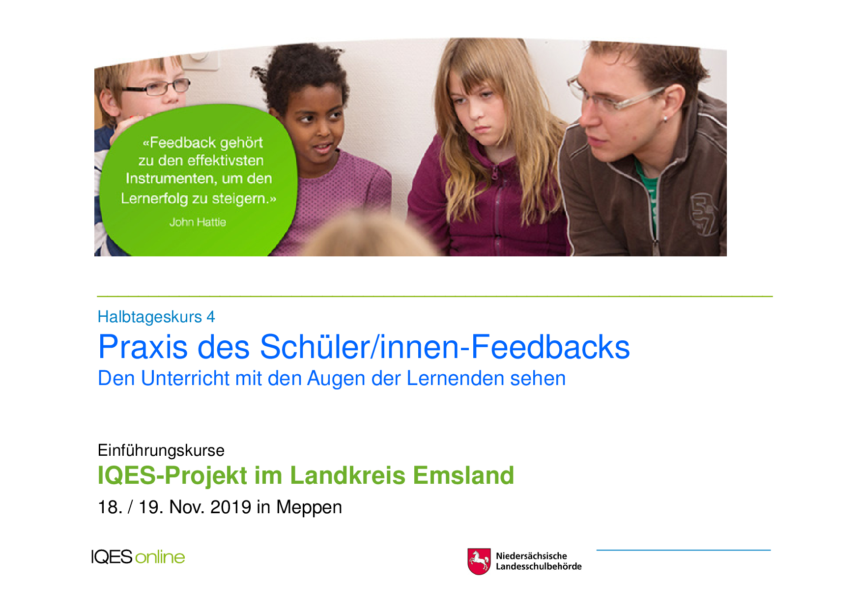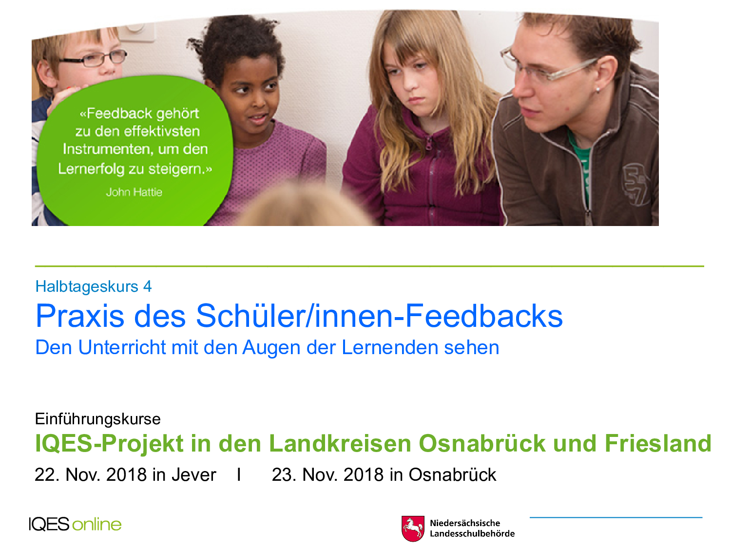 Präsentation zu den Einführungskursen «IQES-Projekt in den Landkreisen Osnabrück und Friesland» vom 21. bis 23. November 2018. Die Präsentation hat unter anderem die Ziele, dass die Teilnehmenden einen Überblick über die auf IQES online zur Verfügung stehenden Instrumente für das Schüler/innen-Feedback erhalten.