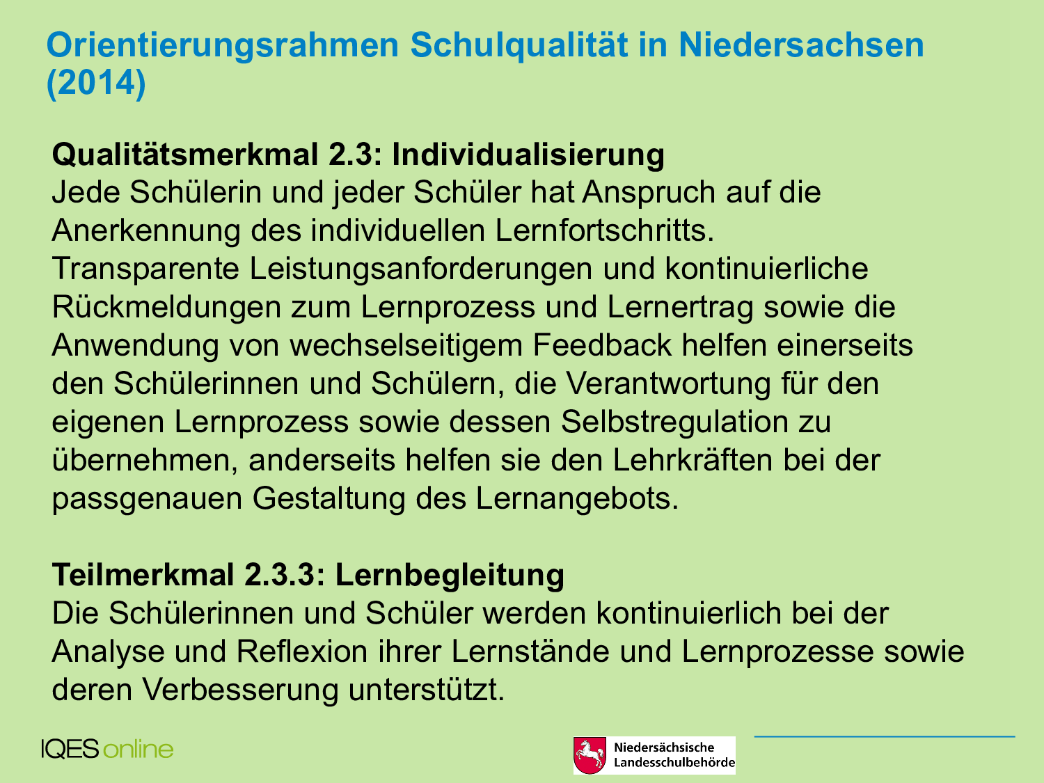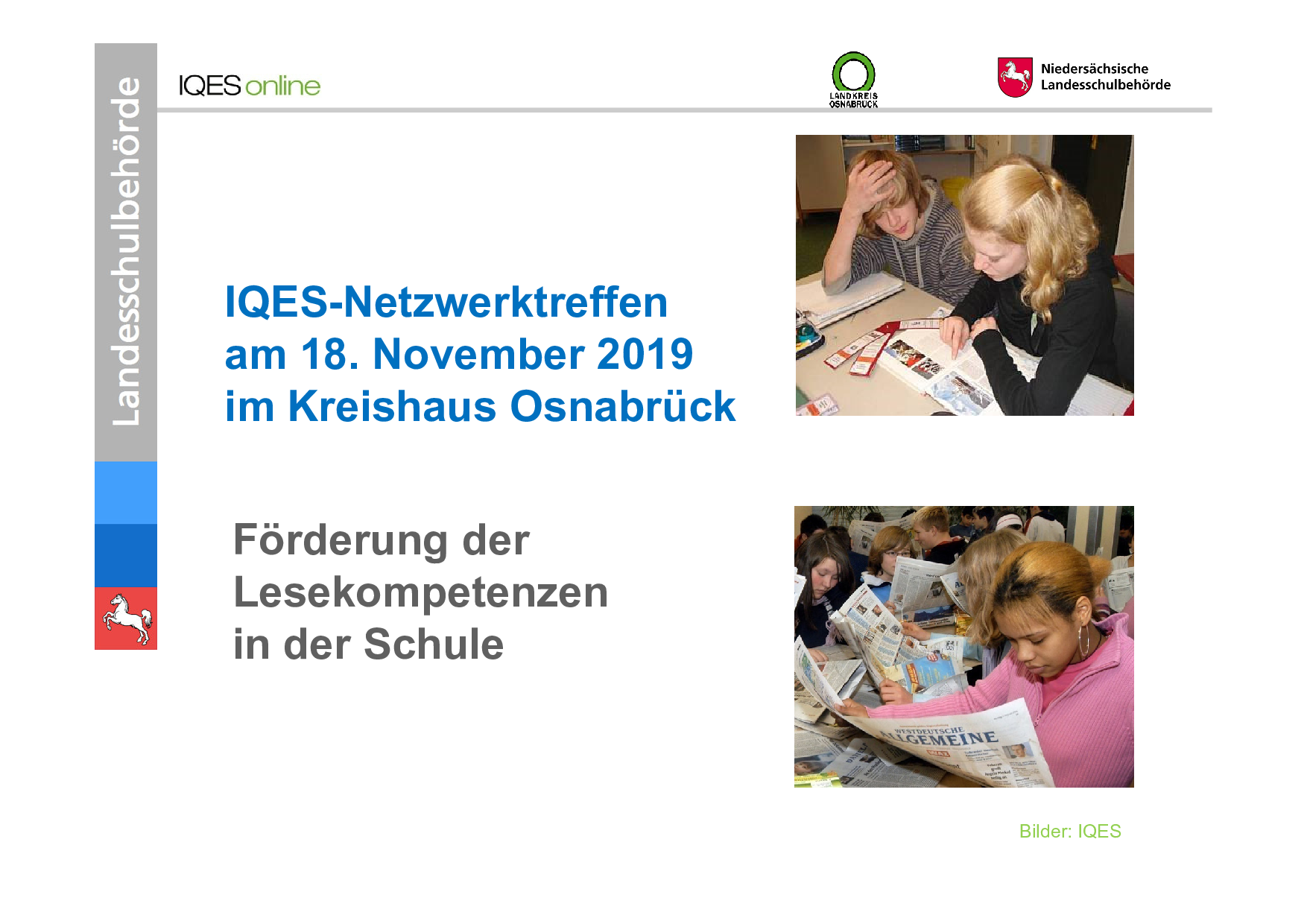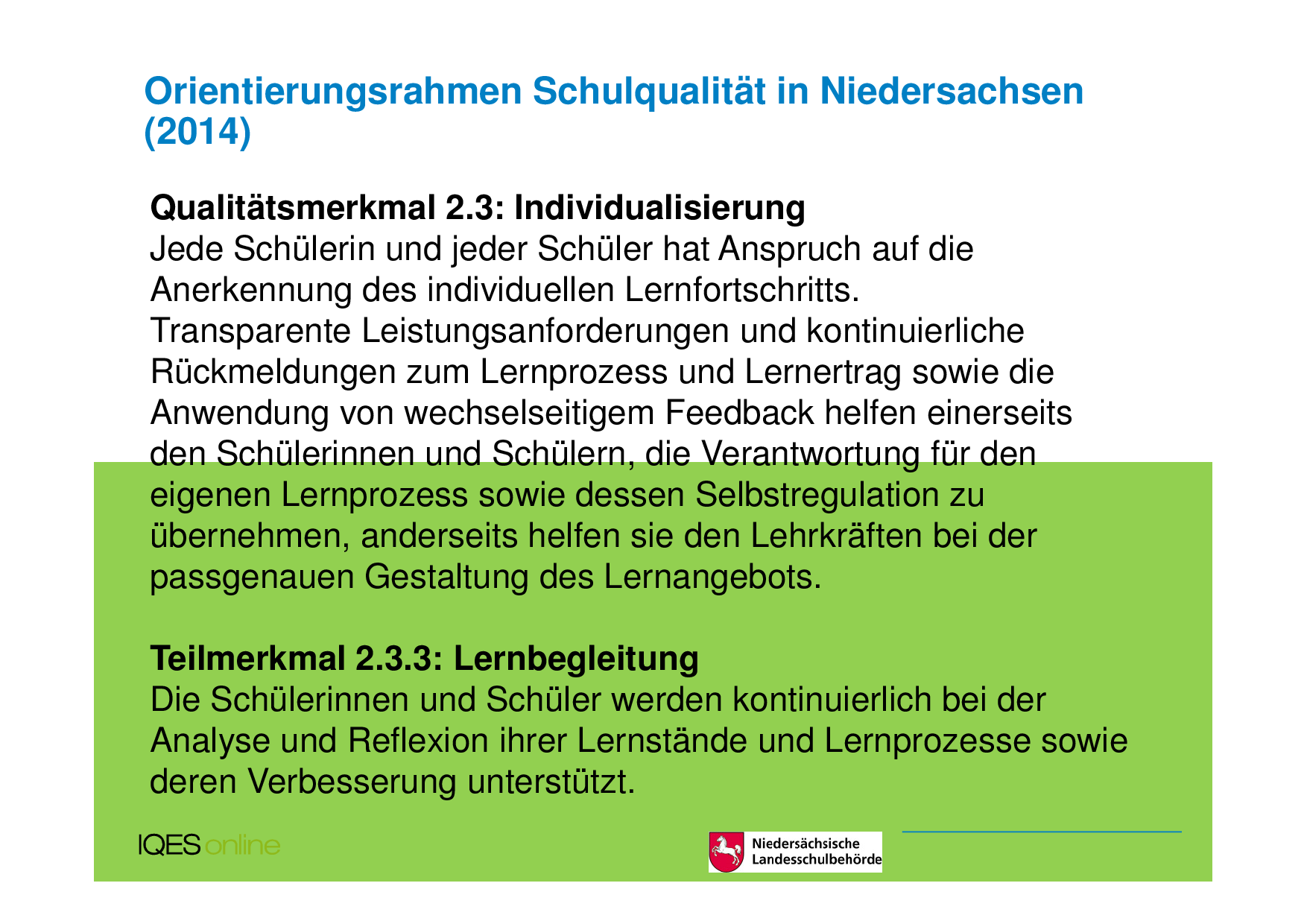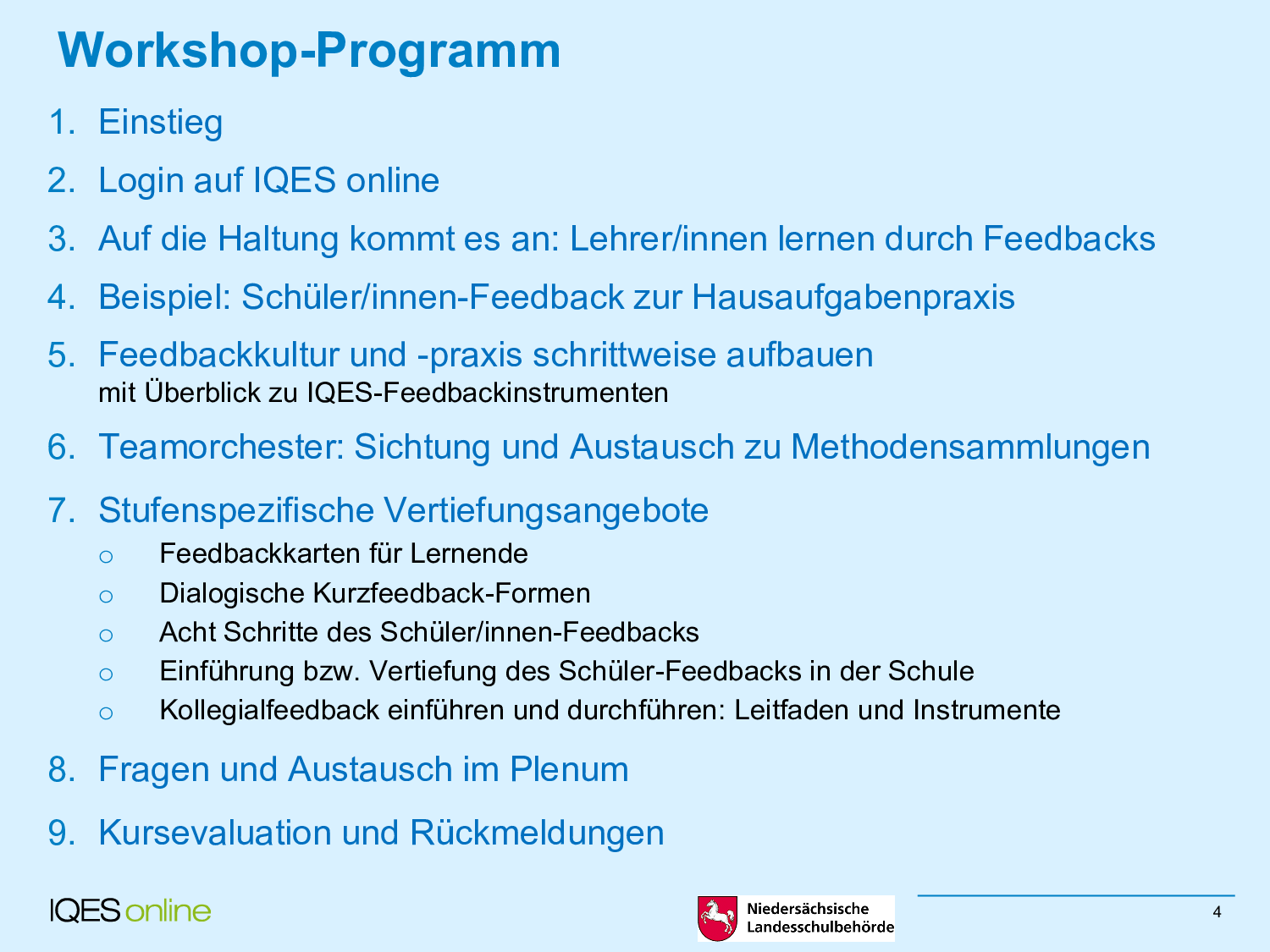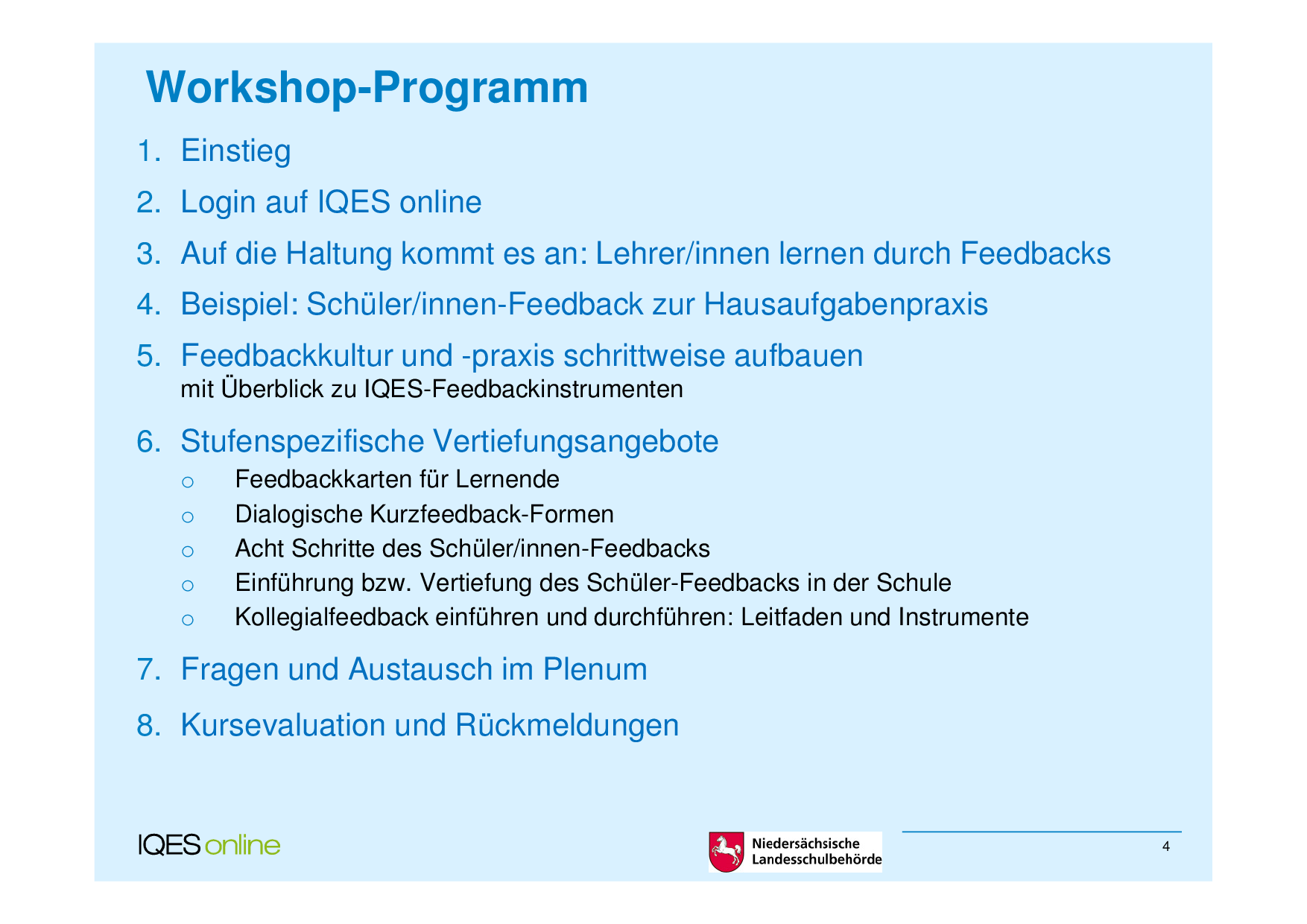 Präsentation zu den Einführungskursen «IQES-Projekt in den Landkreisen Osnabrück und Friesland» vom 21. bis 23. November 2018. Die Präsentation hat unter anderem die Ziele, dass die Teilnehmenden einen Überblick über die auf IQES online zur Verfügung stehenden Instrumente für das Schüler/innen-Feedback erhalten.