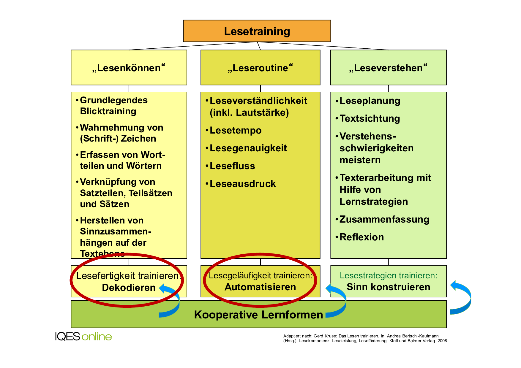 Ein Einblick in das Konzept und die Materialien wird hier gegeben durch die beiden PPTs aus Modul 9.1 und die Arbeitsblätter zum Salzburger Lesescreening und zum Stolperwörter-Test. Für Lehrkräfte-Fortbildungen empfiehlt es sich, diese Tests zu besorgen und im Kurs direkt mit den Lehrkräften durchzuführen.