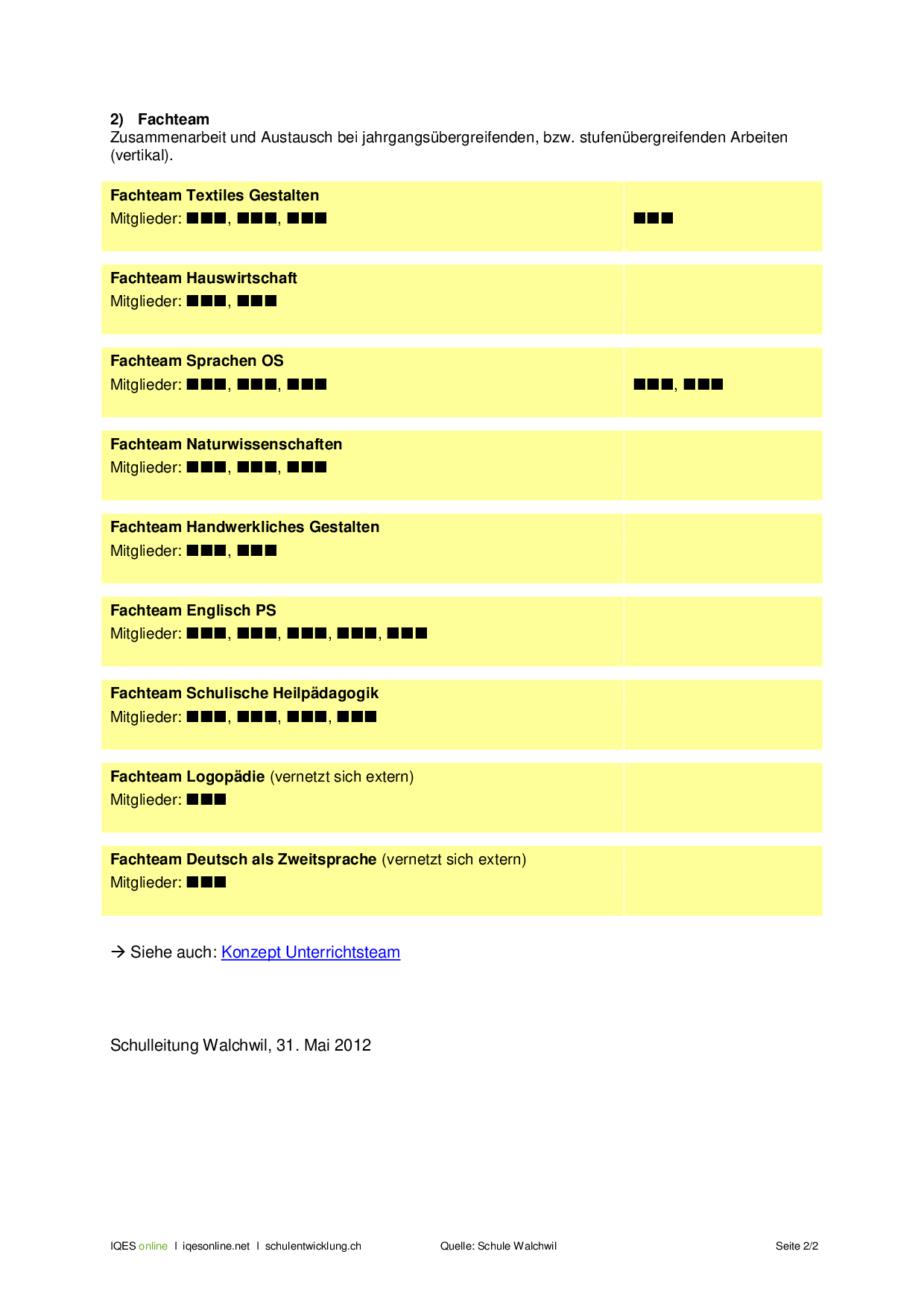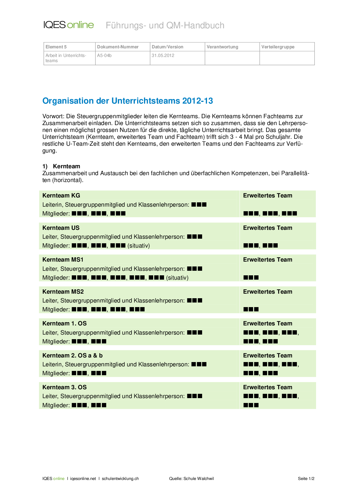 Arbeit in Unterrichtsteams: Organisation der Unterrichtsteams Walchwil.
