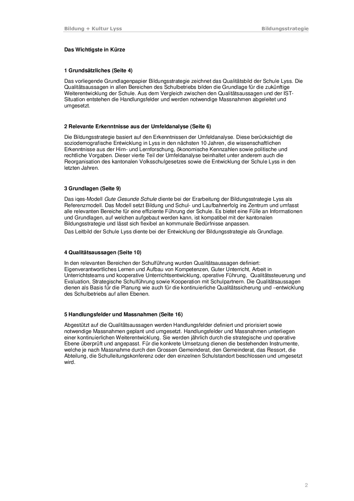 Das vorliegende Grundlagenpapier Bildungsstrategie zeichnet das Qualitätsbild der Schule Lyss auf der Grundlage des IQES-Modells.