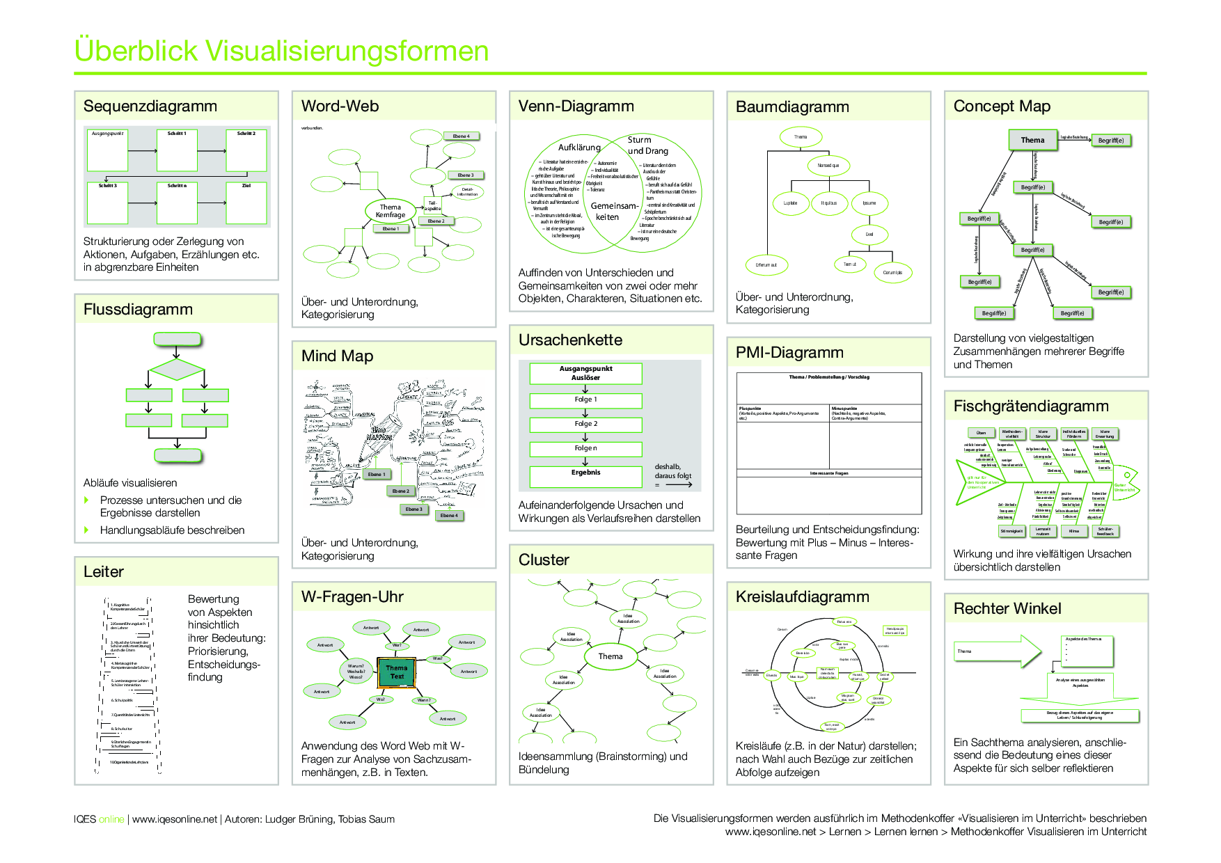 Eine Übersicht über die im Methodenkoffer «Visualisieren im Unterricht» aufgezählten Visualisierungsformen erhalten Sie in diesem Dokument. Sie alle werden mit Name, Grafik und kurzer Beschreibung aufgeführt.