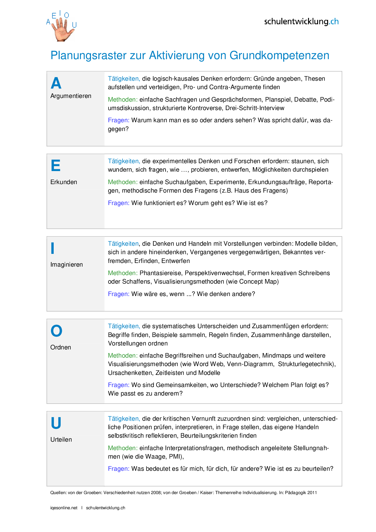 Mithilfe dieses Planungsrasters können Grundkompetenzen aktiviert werden. Zu jeder der fünf Grundkompetenzen werden zu diesem Zweck aktivierende Tätigkeiten, Methoden und Fragen aufgezählt.