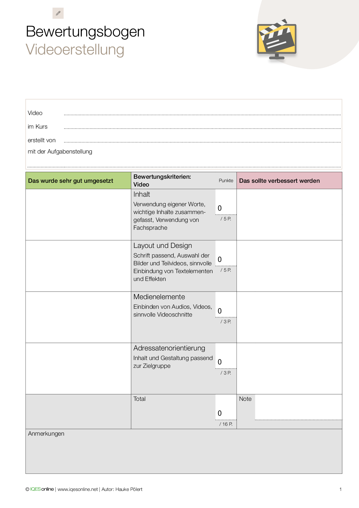 Um die Video-Arbeiten Ihrer Schülerinnen und Schüler zu bewerten eignet sich dieser Bewertungsbogen, mit dem anhand von spezifischen Kriterien schriftliche Rückmeldungen gegeben werden können.