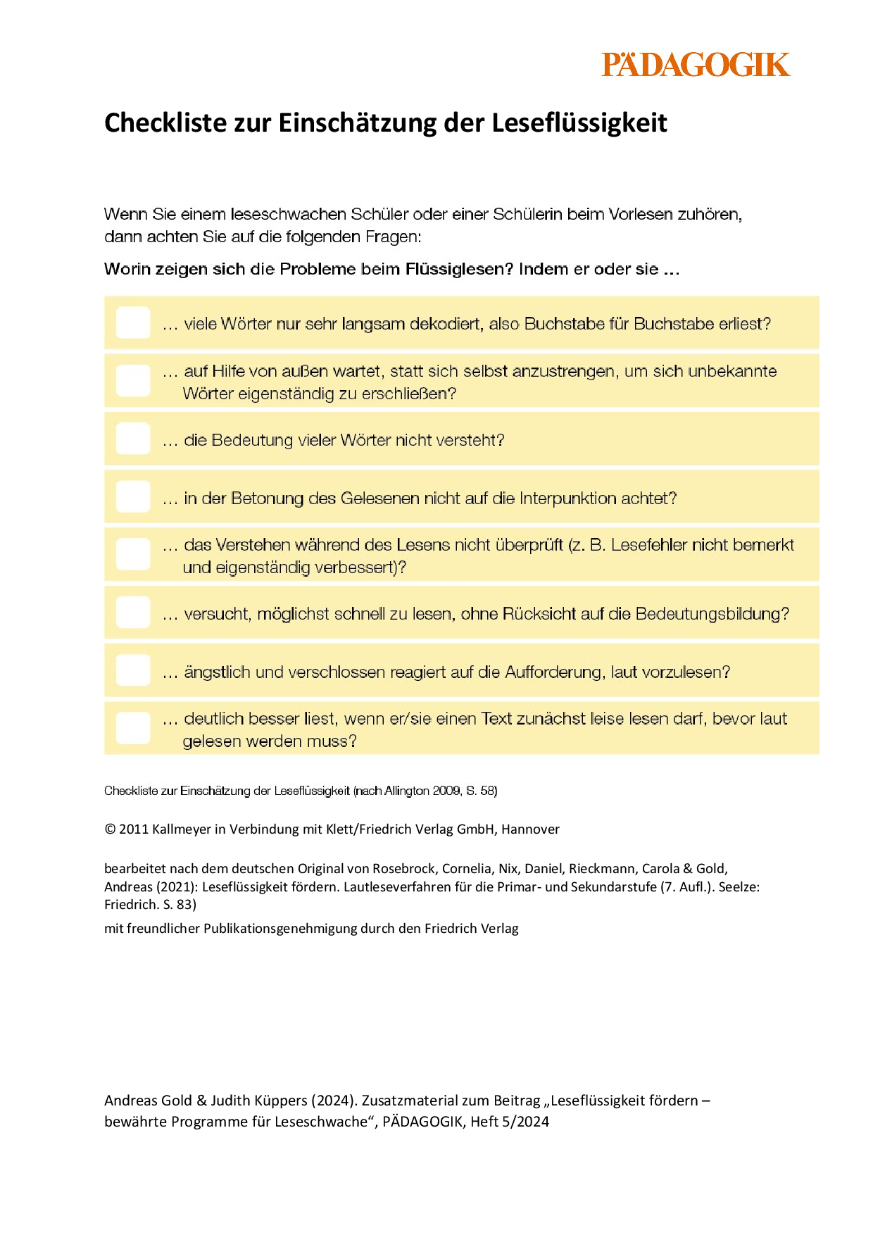 Checkliste zur Einschätzung der Leseflüssigkeit