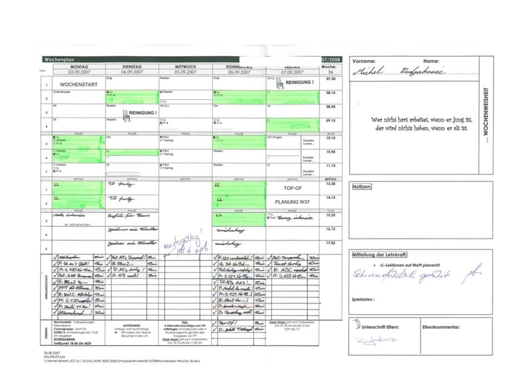 Hier finden Sie ein Beispiel dafür, wie ein Schülerstundenplan mit Phasen des selbstorganisierten Lernens aussehen kann. Dazu sind erklärende Kommentare vorhanden.