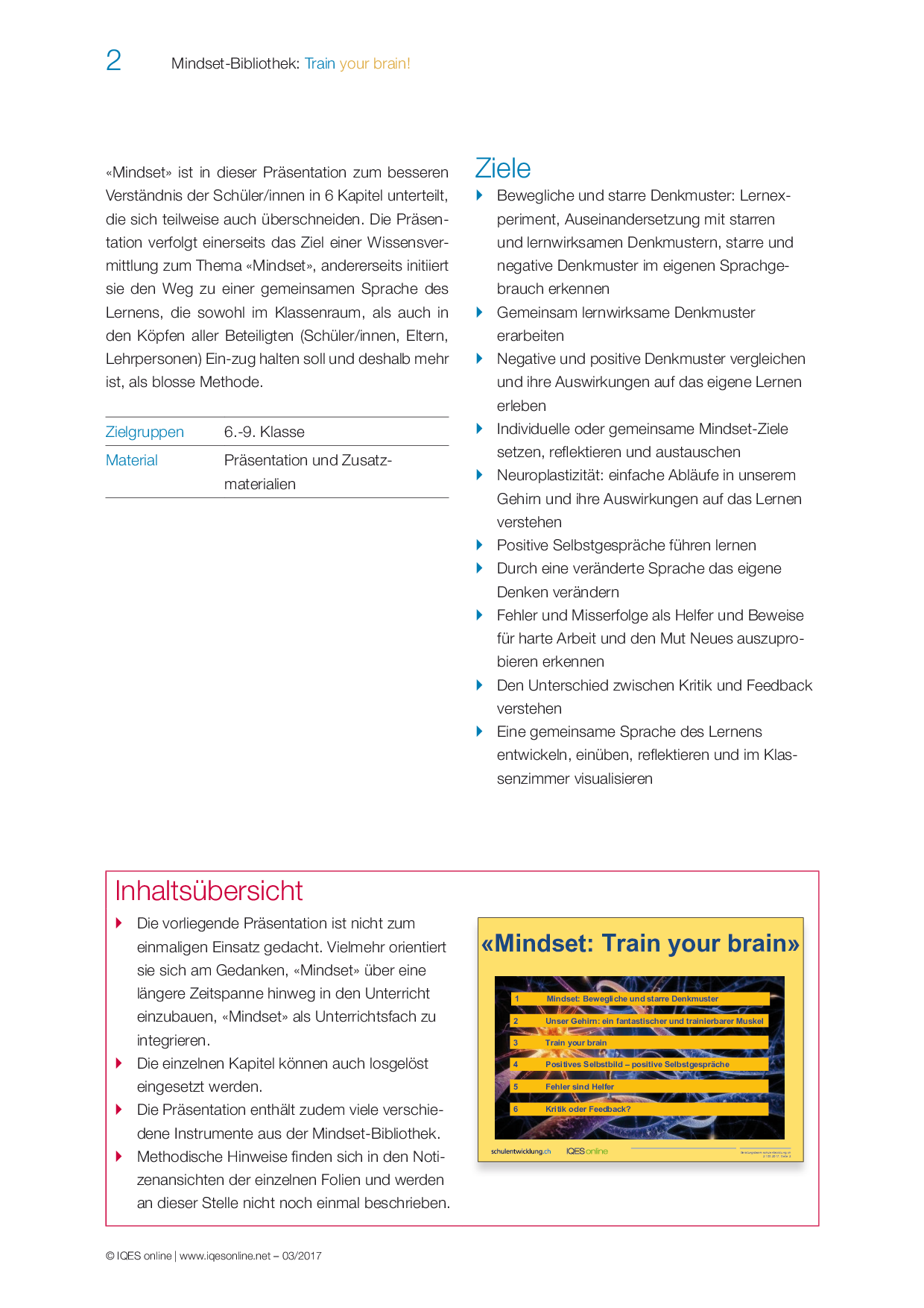 Die Präsentation verfolgt einerseits das Ziel einer Wissensvermittlung zum Thema Mindset, andererseits initiiert sie den Weg zu einer gemeinsamen Sprache des Lernens, die sowohl im Klassenraum, als auch in den Köpfen aller Beteiligten (Schüler und Schülerinnen, Eltern, Lehrpersonen) Einzug halten soll und deshalb mehr ist als blosse Methode.
