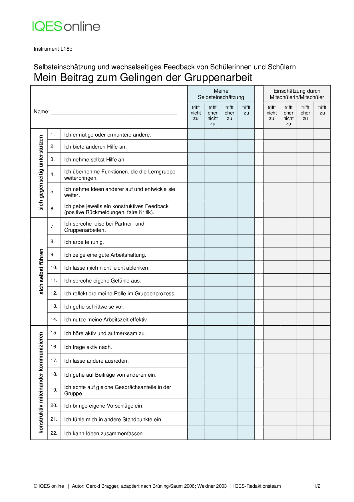 L18b Selbsteinschätzungsbogen für Lernende: Mein Beitrag zum Gelingen der Gruppenarbeit