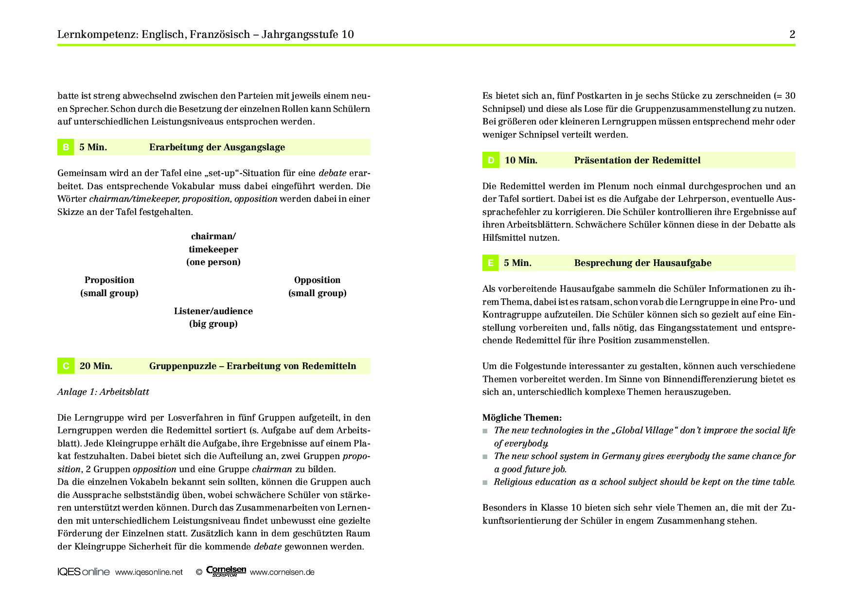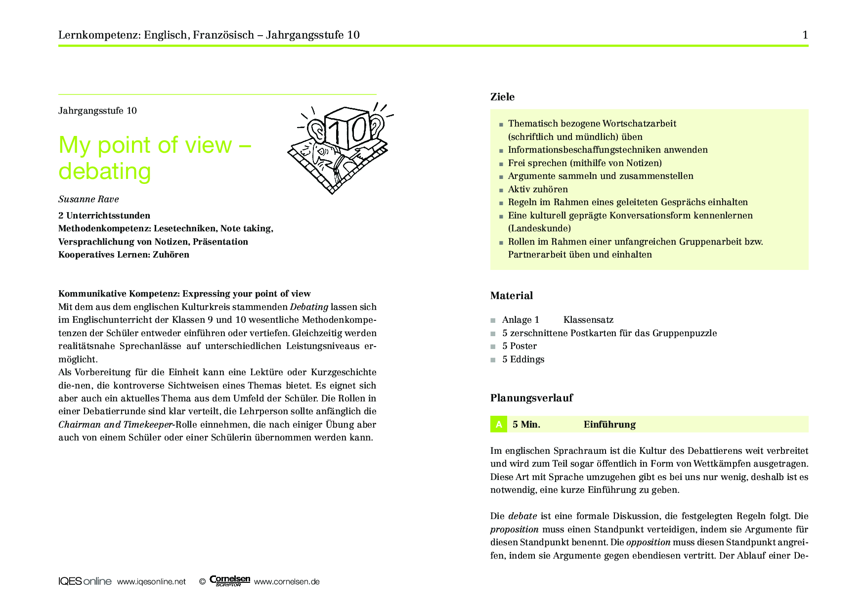 Die Lernenden nähern sich in den hier skizzierten Unterrichtsstunden der englischen Konversationsform debating an. In der ersten Stunde wird die Theorie erarbeitet. In der zweiten soll dann eine Debatte in der Klasse durchgeführt werden.