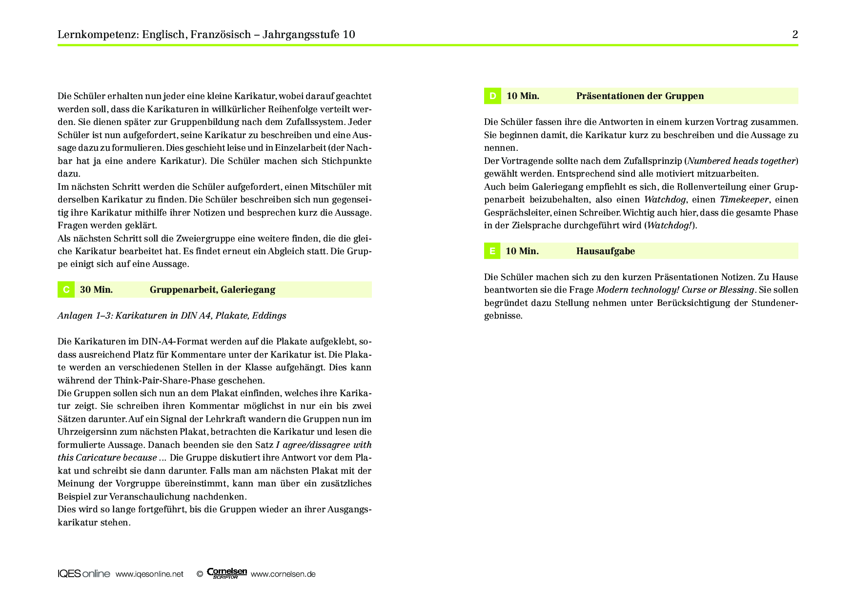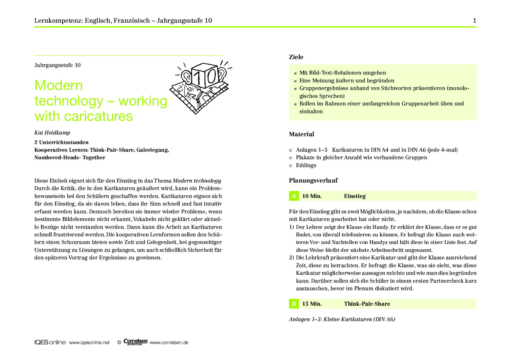 In diesen zwei Unterrichtsstunden üben die Lernenden den Umgang mit Bild-Text-Relationen anhand von Karikaturen in Englisch. Die kooperativen Lernformen sollen den Schülerinnen und Schülern dabei Zeit und Gelegenheit geben, bei gegenseitiger Unterstützung zu Lösungen zu gelangen.