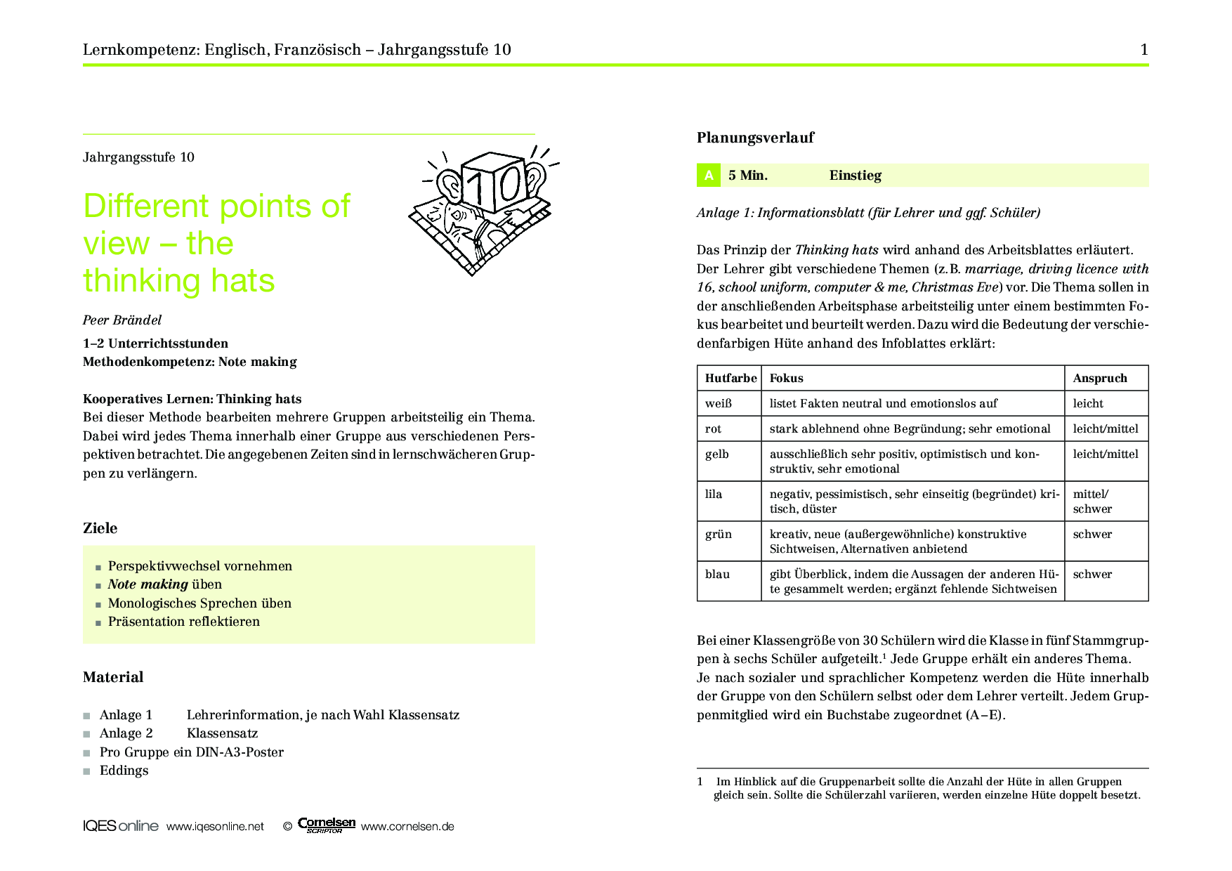 In dieser Lerneinheit à 1 bis 2 Lektionen wird die Kooperative Lernmethode thinking hats verwendet: Bei dieser Methode bearbeiten mehrere Gruppen arbeitsteilig ein Thema. Dabei wird jedes Thema innerhalb einer Gruppe aus verschiedenen Perspektiven betrachtet.