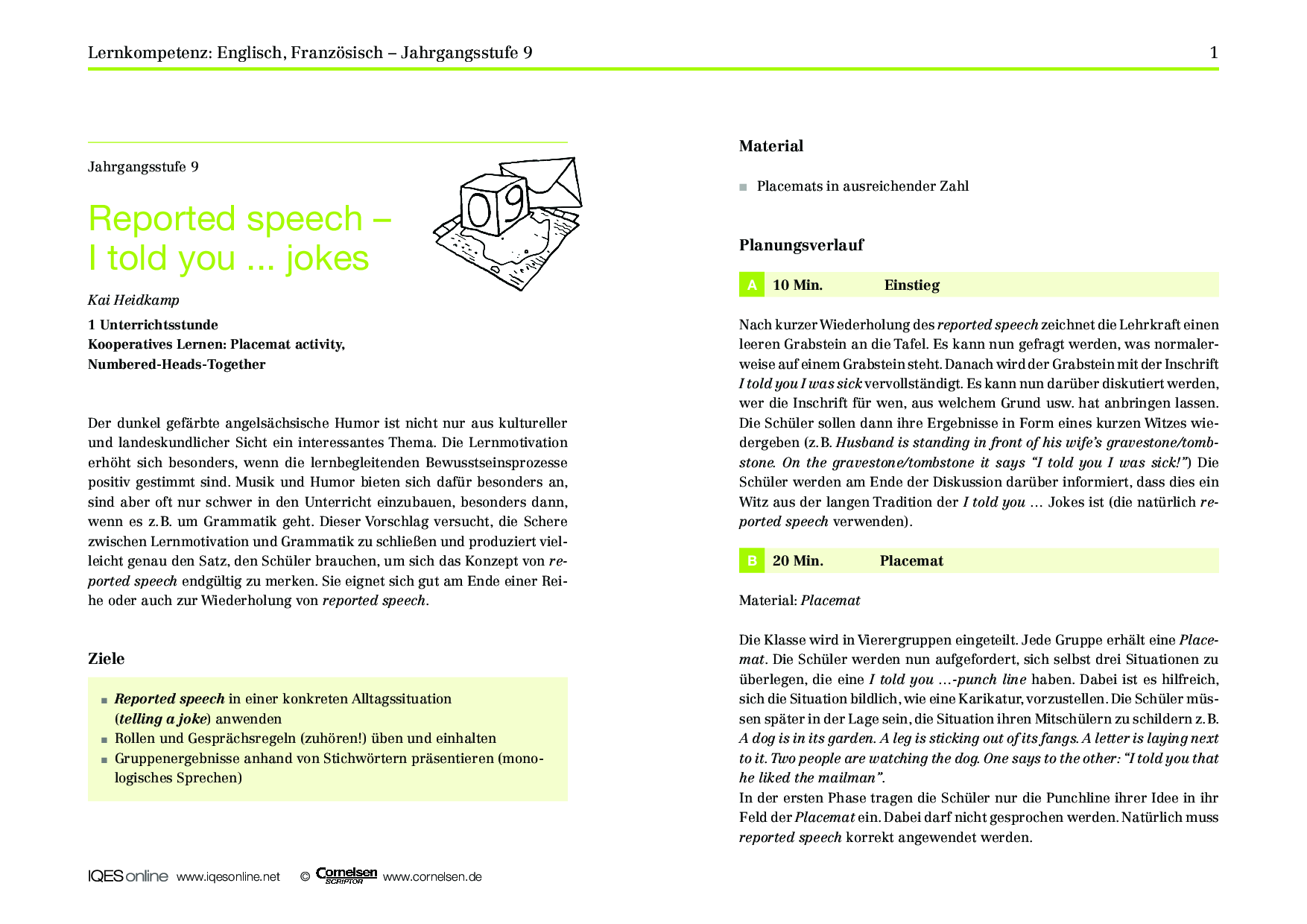 In diesem Dossier stellen wir Material für 1 Unterrichtsstunde im Fremdsprachenunterricht zur Verfügung. Die indirekte Rede wird mit dem Vorschlag aus dem Dossier spielerisch eingeübt. Es eignet sich für die Jahrgangsstufe 9.