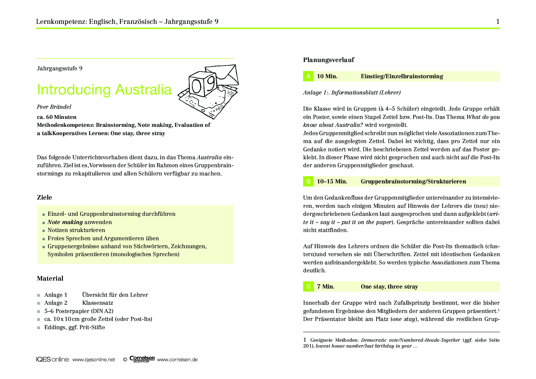 Das in diesem Dokument beschriebene Unterrichtsvorhaben dient dazu, in das Thema Australia einzuführen. Ziel ist es, Vorwissen der Lernenden im Rahmen eines Gruppenbrainstormings zu rekapitulieren und allen verfügbar zu machen.